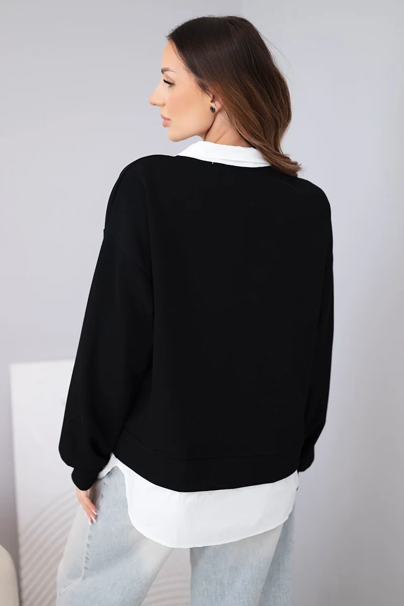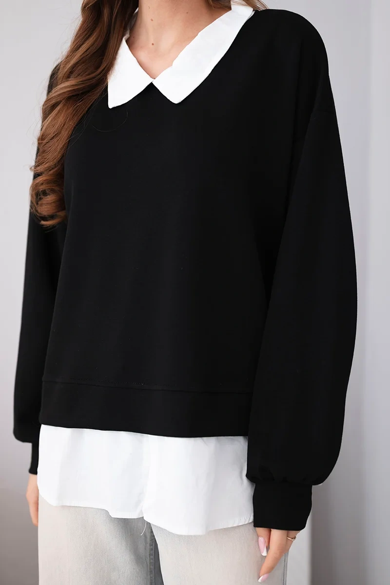 Stylowa bluza damska z efektowną koszulową wstawką to idealne połączenie elegancji i wygody. Model łączy klasyczny fason bluzy z doszytą dolną częścią imitującą koszulę oraz kołnierzykiem, co tworzy modny, warstwowy efekt bez potrzeby zakładania dwóch osobnych elementów garderoby.