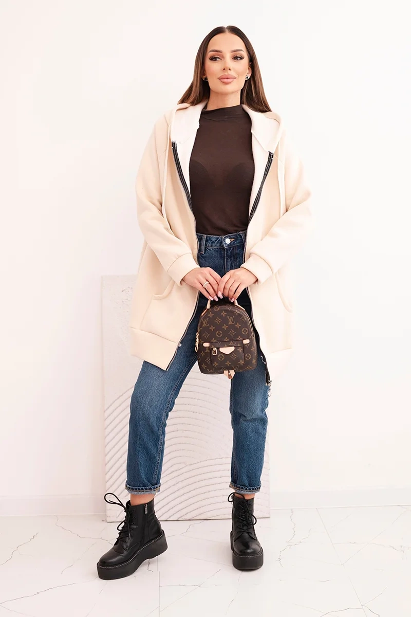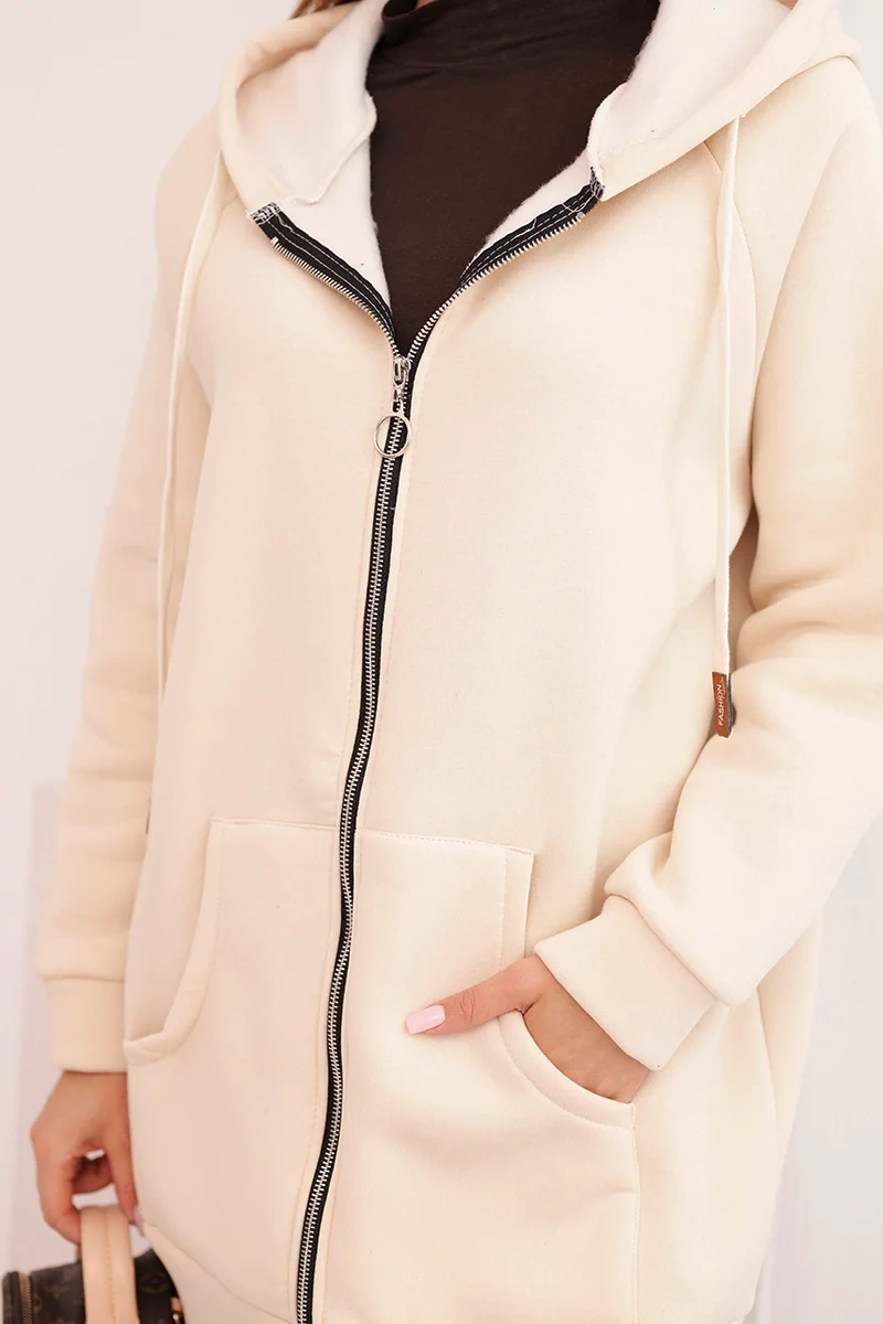 Bluza damska ocieplana bluza z kapturem i zamkiem beżowa Ta bluza damska ocieplana z kapturem to idealna propozycja na chłodniejsze dni. Wykonana z przyjemnej, grubszej dzianiny, zapewnia komfort i ciepło, a prosty fason świetnie sprawdzi się w stylizacjach codziennych. Model posiada praktyczny zamek na całej długości, duży kaptur z szerokimi sznurkami oraz pojemne kieszenie z przodu. Dłuższy krój zapewnia wygodę i dodatkową osłonę przed chłodem.