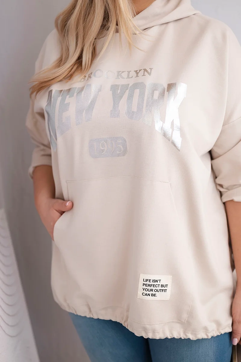 Bluza damska Plus Size wiskozowa z kapturem i kieszenią kangurką beżowa Modna bluza damska Plus Size z kapturem to idealna propozycja dla kobiet ceniących wygodę i stylowy, miejski look. Luźny fason zapewnia swobodę ruchów, a przedłużony tył nadaje nowoczesnego charakteru i optycznie wysmukla sylwetkę.