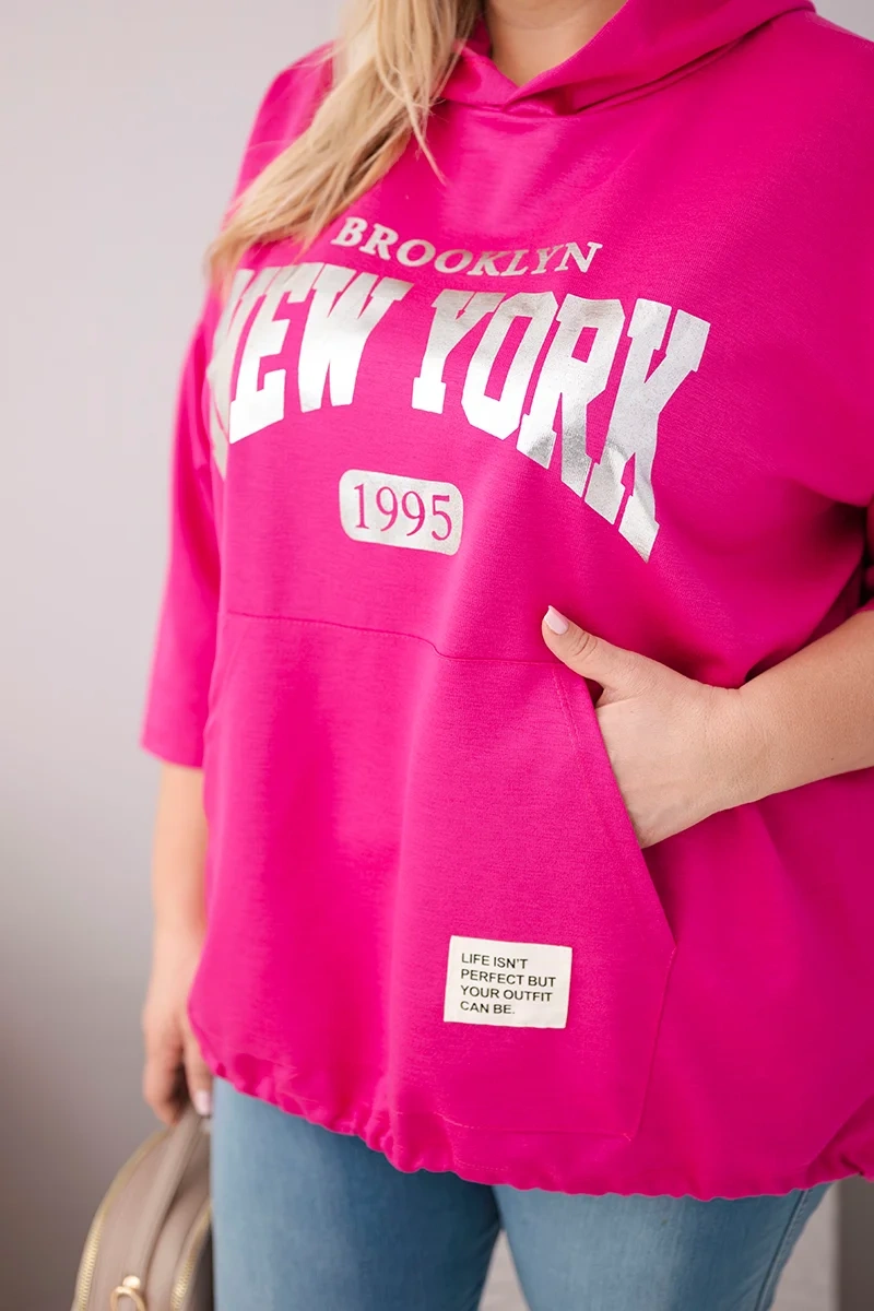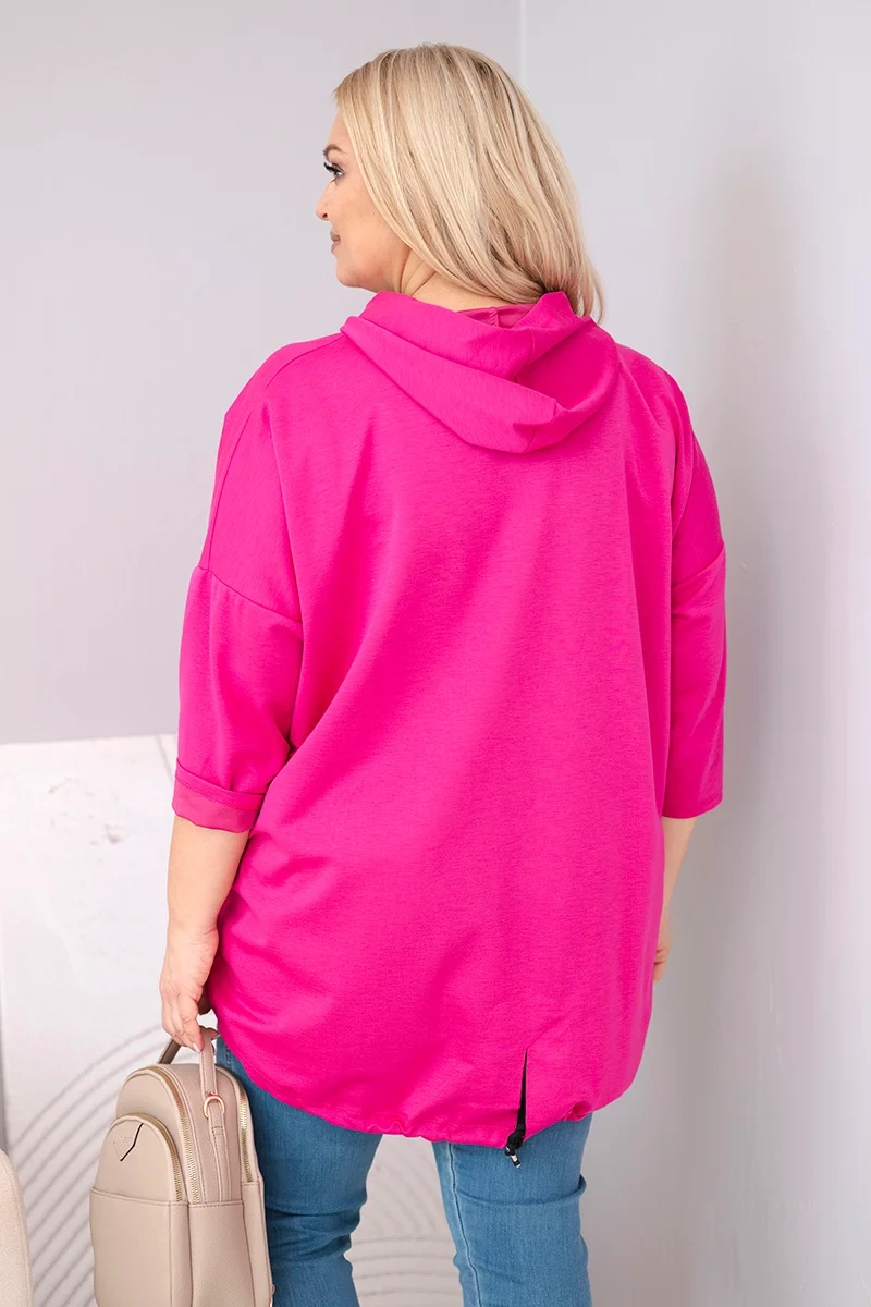 Bluza damska Plus Size wiskozowa z kapturem i kieszenią kangurką fuksja Modna bluza damska Plus Size z kapturem to idealna propozycja dla kobiet ceniących wygodę i stylowy, miejski look. Luźny fason zapewnia swobodę ruchów, a przedłużony tył nadaje nowoczesnego charakteru i optycznie wysmukla sylwetkę.