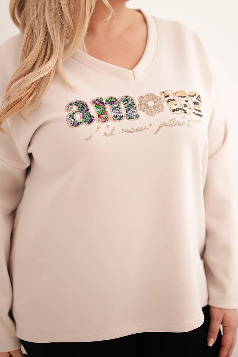 Bluza damska Plus Size z napisem i dekoltem V beżowa Ta bluza damska plus size to idealne połączenie wygody, stylu i kobiecego akcentu. Wykonana z miękkiej, przyjemnej w dotyku mieszanki wiskozy i poliestru, gwarantuje komfort noszenia przez cały dzień. Model posiada luźny krój z dekoltem w serek, który optycznie wysmukla sylwetkę, oraz ozdobny napis z błyszczącymi detalami nadający modnego charakteru. Dłuższy tył świetnie maskuje biodra i sprawia, że bluza pasuje do legginsów, jeansów czy spodni typu slim. Doskonały wybór na co dzień, do pracy, spacer lub luźne spotkania z przyjaciółmi.
