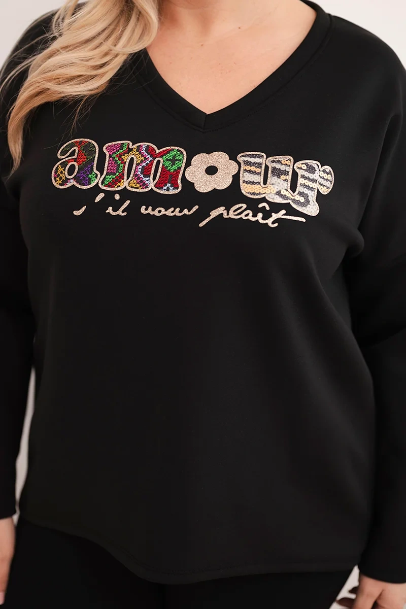 Bluza damska Plus Size z napisem i dekoltem V czarna Ta bluza damska plus size to idealne połączenie wygody, stylu i kobiecego akcentu. Wykonana z miękkiej, przyjemnej w dotyku mieszanki wiskozy i poliestru, gwarantuje komfort noszenia przez cały dzień. Model posiada luźny krój z dekoltem w serek, który optycznie wysmukla sylwetkę, oraz ozdobny napis z błyszczącymi detalami nadający modnego charakteru. Dłuższy tył świetnie maskuje biodra i sprawia, że bluza pasuje do legginsów, jeansów czy spodni typu slim. Doskonały wybór na co dzień, do pracy, spacer lub luźne spotkania z przyjaciółmi.