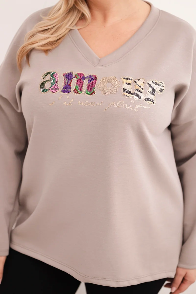 Bluza damska Plus Size z napisem i dekoltem V fango Ta bluza damska plus size to idealne połączenie wygody, stylu i kobiecego akcentu. Wykonana z miękkiej, przyjemnej w dotyku mieszanki wiskozy i poliestru, gwarantuje komfort noszenia przez cały dzień. Model posiada luźny krój z dekoltem w serek, który optycznie wysmukla sylwetkę, oraz ozdobny napis z błyszczącymi detalami nadający modnego charakteru. Dłuższy tył świetnie maskuje biodra i sprawia, że bluza pasuje do legginsów, jeansów czy spodni typu slim. Doskonały wybór na co dzień, do pracy, spacer lub luźne spotkania z przyjaciółmi.