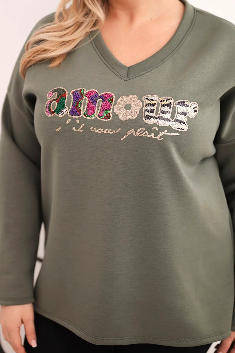 Bluza damska Plus Size z napisem i dekoltem V khaki Ta bluza damska plus size to idealne połączenie wygody, stylu i kobiecego akcentu. Wykonana z miękkiej, przyjemnej w dotyku mieszanki wiskozy i poliestru, gwarantuje komfort noszenia przez cały dzień. Model posiada luźny krój z dekoltem w serek, który optycznie wysmukla sylwetkę, oraz ozdobny napis z błyszczącymi detalami nadający modnego charakteru. Dłuższy tył świetnie maskuje biodra i sprawia, że bluza pasuje do legginsów, jeansów czy spodni typu slim. Doskonały wybór na co dzień, do pracy, spacer lub luźne spotkania z przyjaciółmi.