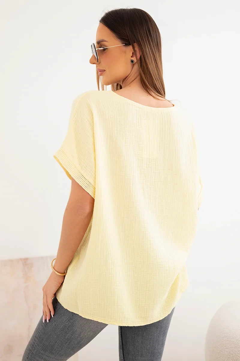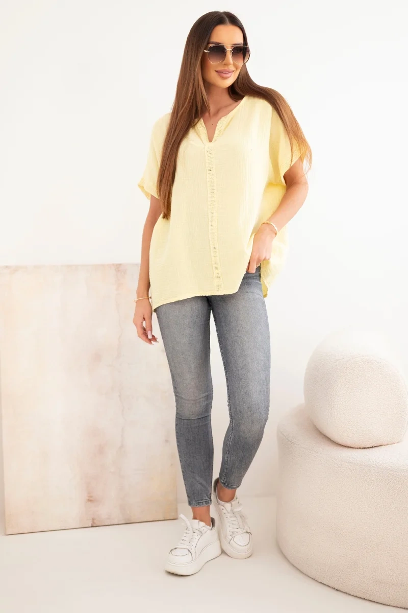 Bluzka damska bawełniana muślinowa oversize z dekoltem V i koronką żółta