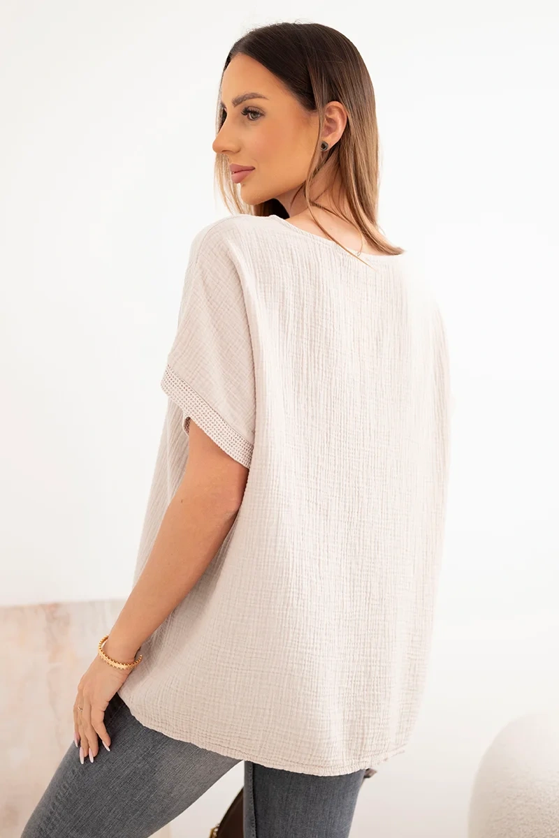 Bluzka damska bawełniana oversize z dekoltem V i koronką beżowa
