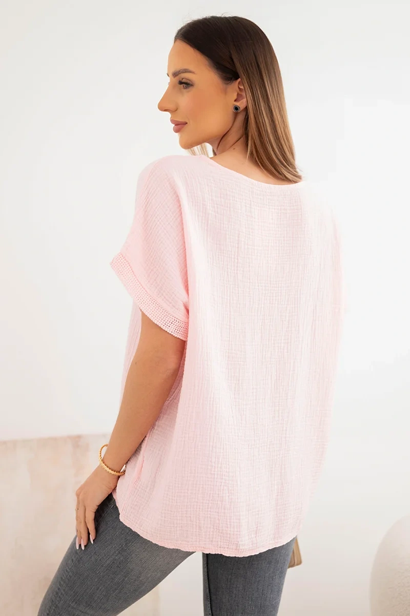 Luźna i niezwykle komfortowa bluzka damska wykonana z naturalnej bawełny to idealna propozycja na codzienne stylizacje. Model o oversize’owym kroju zapewnia swobodę ruchów i doskonale układa się na sylwetce, maskując ewentualne niedoskonałości. Dekolt w kształcie litery V został subtelnie wykończony ozdobną koronką, która dodaje całości delikatnego, kobiecego charakteru.