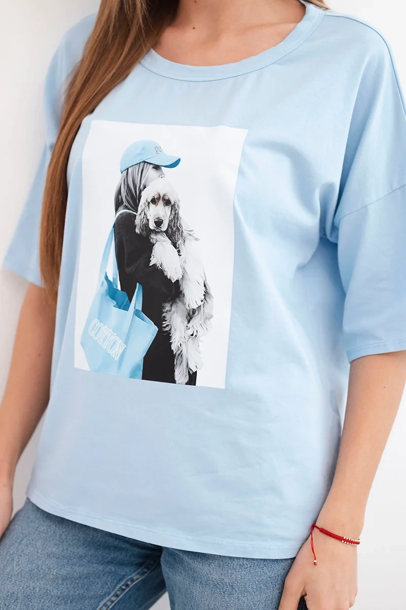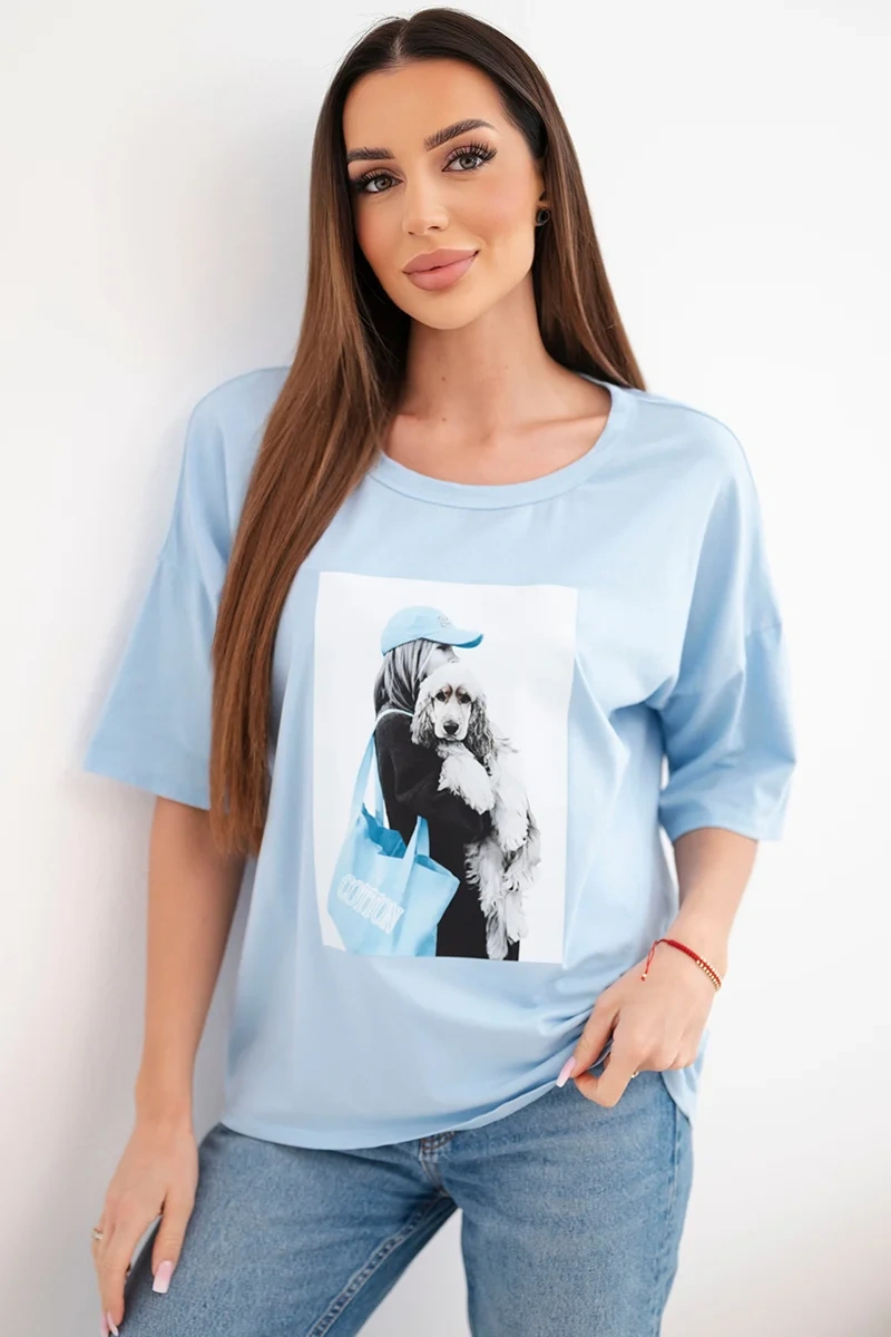 Bluzka damska bawełniana oversize z krótkim rękawem i modnym nadrukiem niebieska