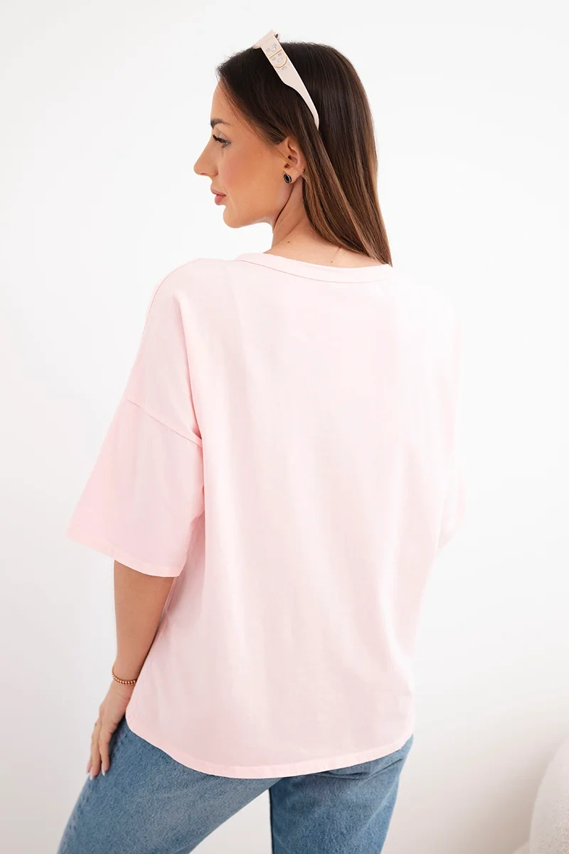 Bluzka damska bawełniana oversize z krótkim rękawem i modnym nadrukiem pudrowy róż
