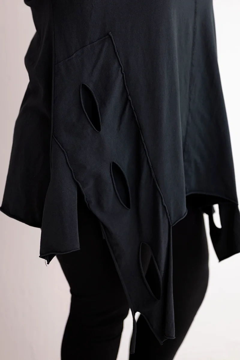 Bluzka damska bawełniana Plus Size z asymetrycznym dołem i wycięciami czarna Szukasz wygodnej i oryginalnej bluzki, która wyróżni Twoją stylizację? Bluzka damska Plus Size z asymetrycznym dołem i dekoracyjnymi wycięciami to propozycja, która łączy komfort noszenia z nowoczesnym stylem. Dłuższy krój z przodu oraz fantazyjne cięcia nadają jej lekkości i niepowtarzalnego charakteru.