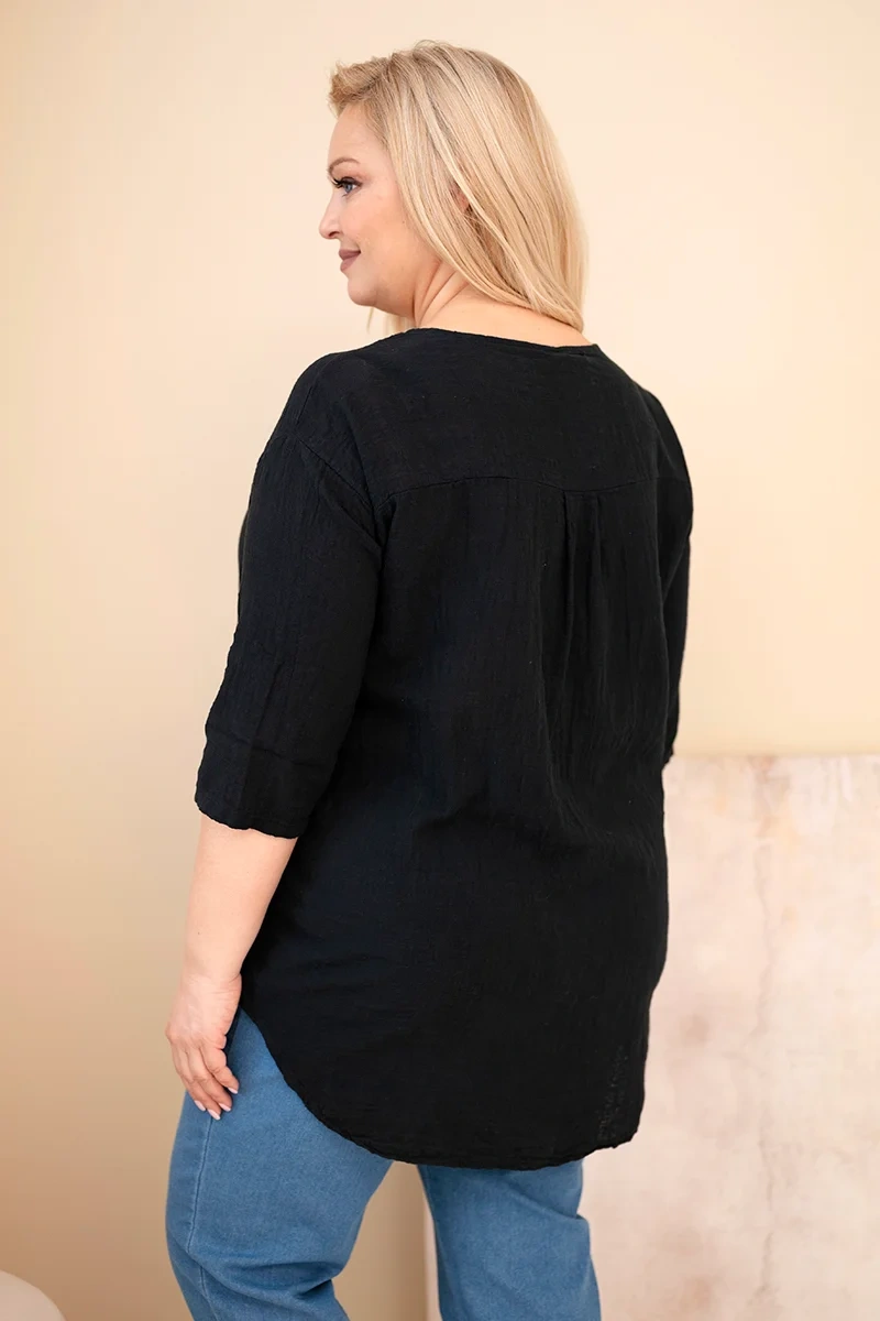 Bluzka damska bawełniana Plus Size z dekoltem na guziki czarna Bluzka damska plus size to idealna propozycja dla kobiet ceniących komfort, naturalne materiały oraz ponadczasowy styl. Wykonana w 100% z bawełny, jest lekka, przewiewna i przyjazna dla skóry, dzięki czemu doskonale sprawdzi się w cieplejsze dni. To model, który łączy wygodę z uniwersalnym designem, pasującym do wielu codziennych stylizacji.