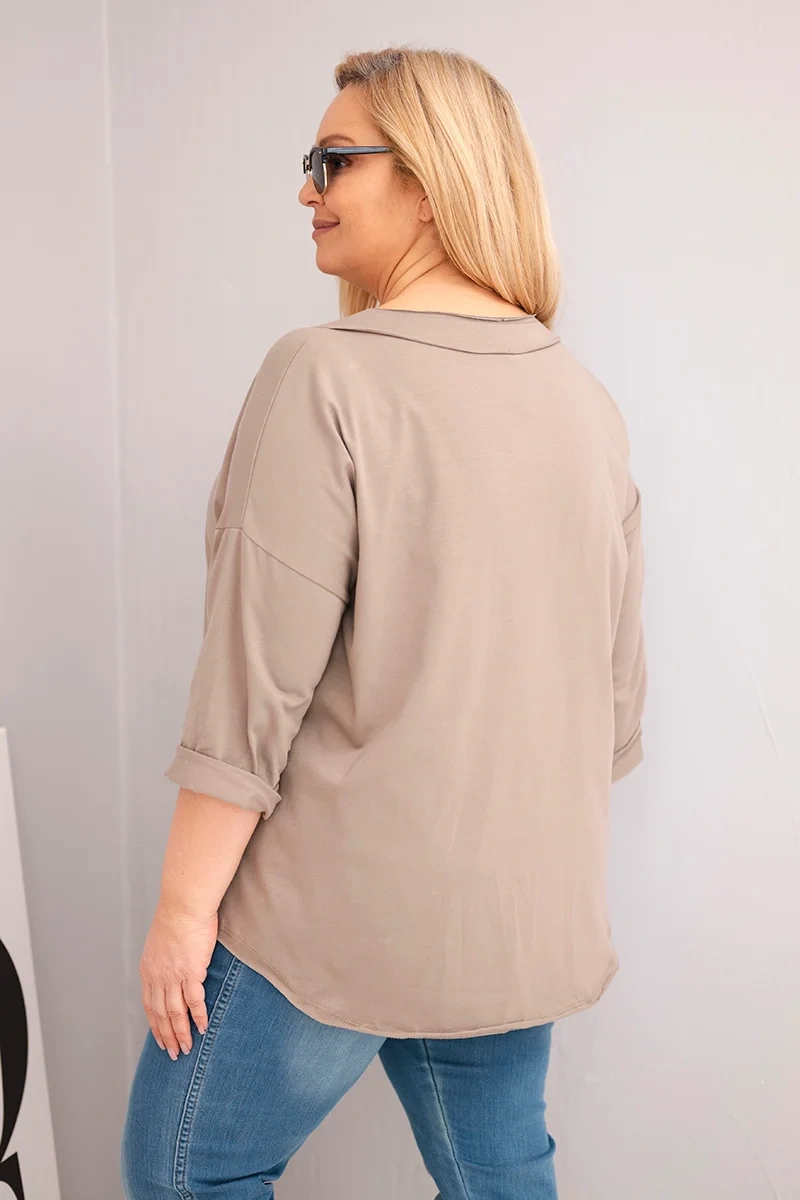 Bluzka damska bawełniana Plus Size z głębokim dekoltem V i asymetrycznym dołem fango Jeśli cenisz wygodę połączoną z modnym wyglądem, ta bluzka damska Plus Size z głębokim dekoltem V i asymetrycznym dołem będzie doskonałym wyborem. Luźny, komfortowy krój sprawia, że świetnie leży na sylwetce, a dzięki elastycznemu materiałowi dopasowuje się do ruchów ciała, nie krępując ich.
