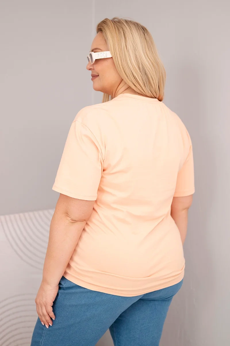 Bluzka damska bawełniana Plus Size z krótkim rękawem basic łososiowa Bluzka damska plus size o klasycznym, prostym kroju to doskonała baza do wielu codziennych stylizacji. Model o luźnym fasonie zapewnia swobodę ruchów i komfort noszenia przez cały dzień. To idealna bluzka damska basic, która sprawdzi się zarówno w casualowych, jak i bardziej sportowych zestawach.