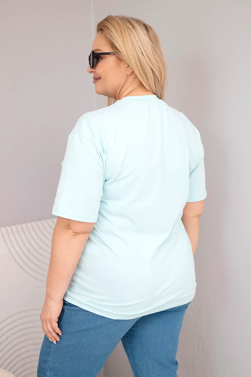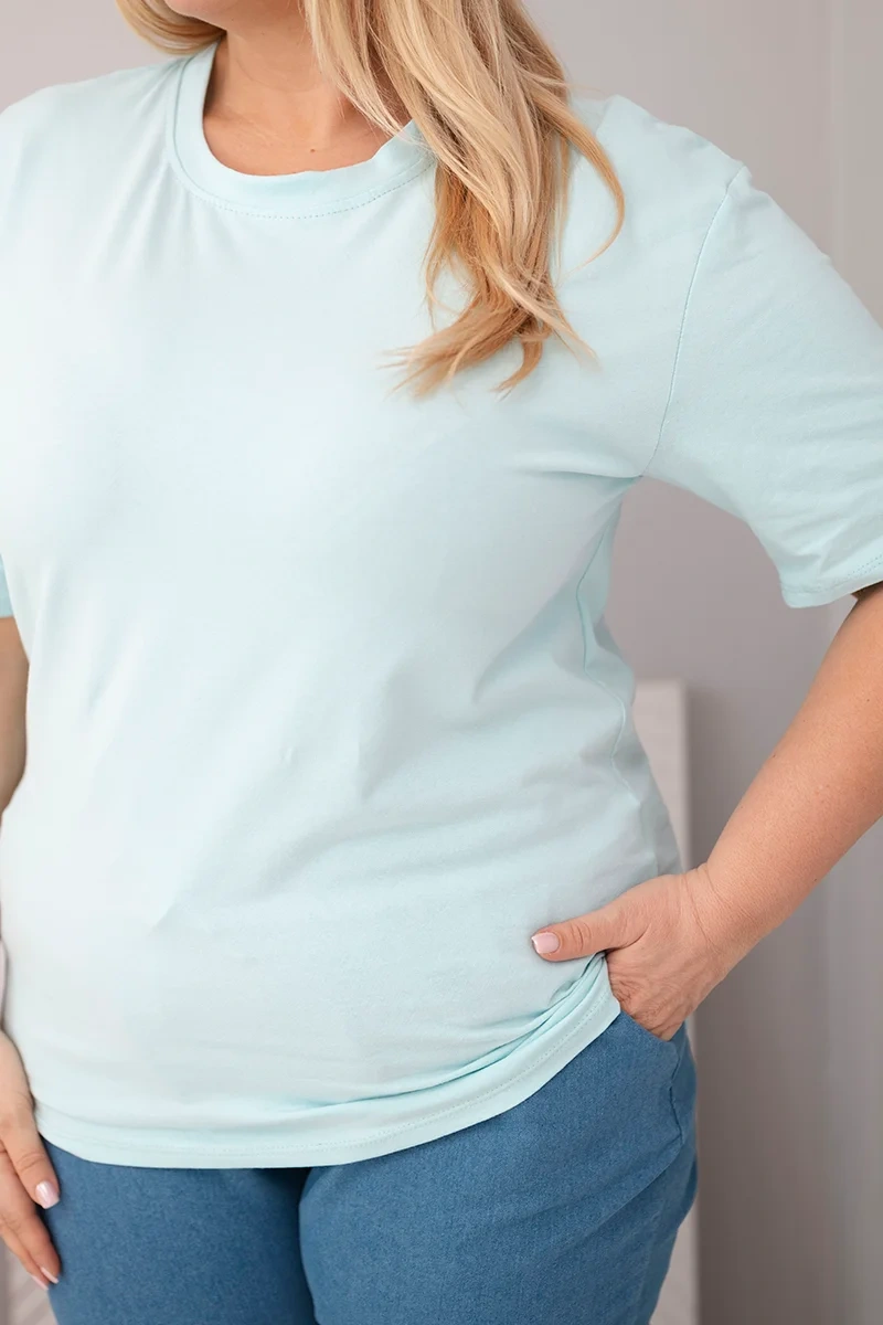 Bluzka damska bawełniana Plus Size z krótkim rękawem basic miętowa Bluzka damska plus size o klasycznym, prostym kroju to doskonała baza do wielu codziennych stylizacji. Model o luźnym fasonie zapewnia swobodę ruchów i komfort noszenia przez cały dzień. To idealna bluzka damska basic, która sprawdzi się zarówno w casualowych, jak i bardziej sportowych zestawach.