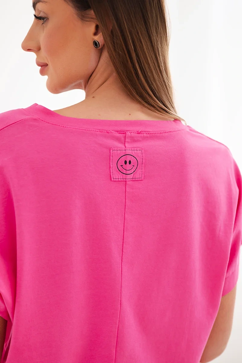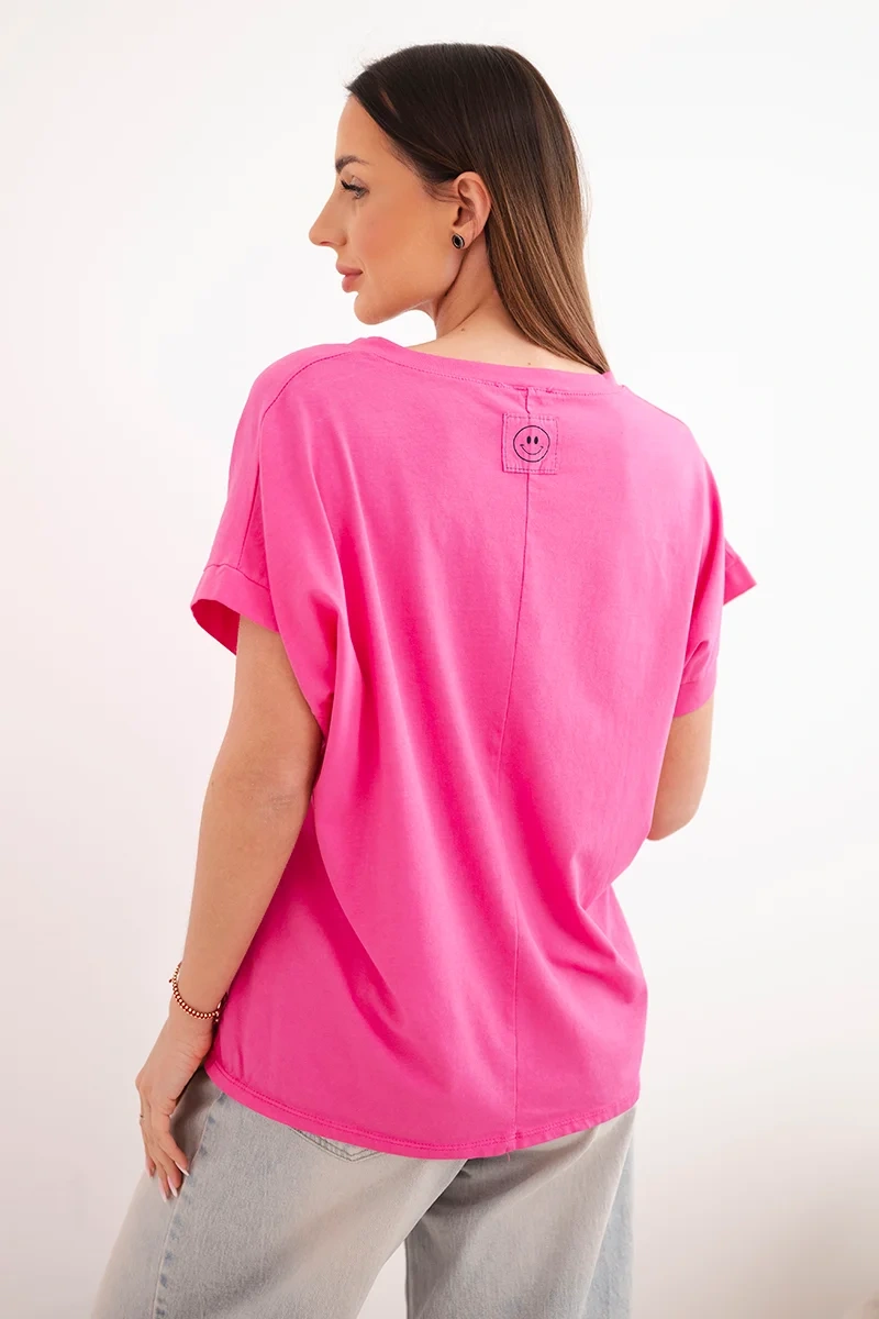 Bluzka damska bawełniana z dekoltem V i krótkim rękawem fuksja