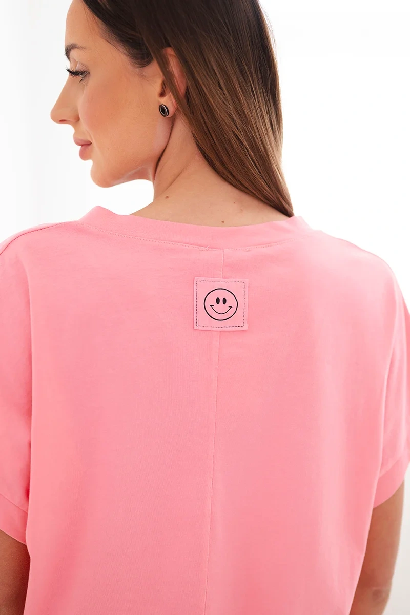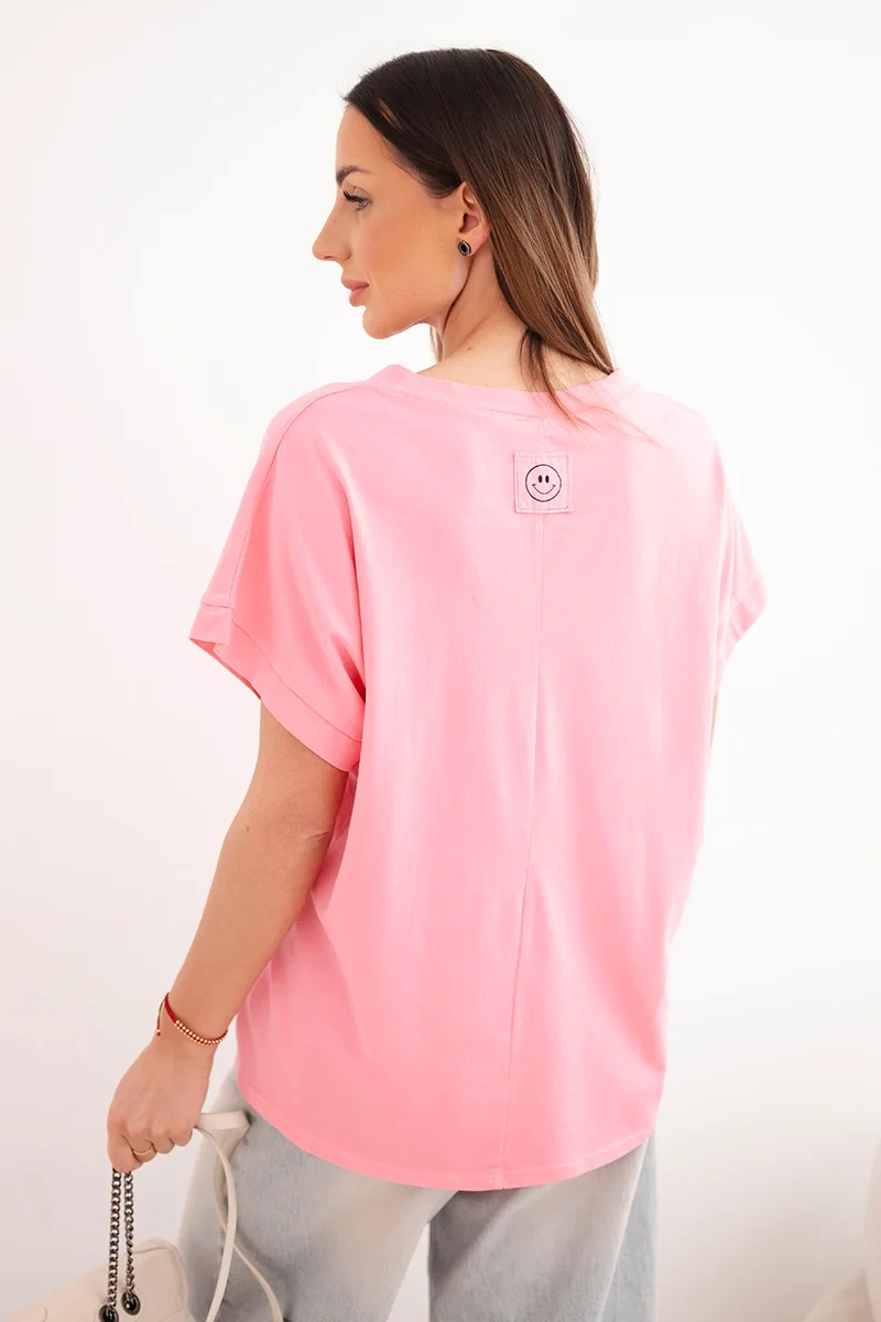 Bluzka damska bawełniana z dekoltem V i krótkim rękawem jasno różowa