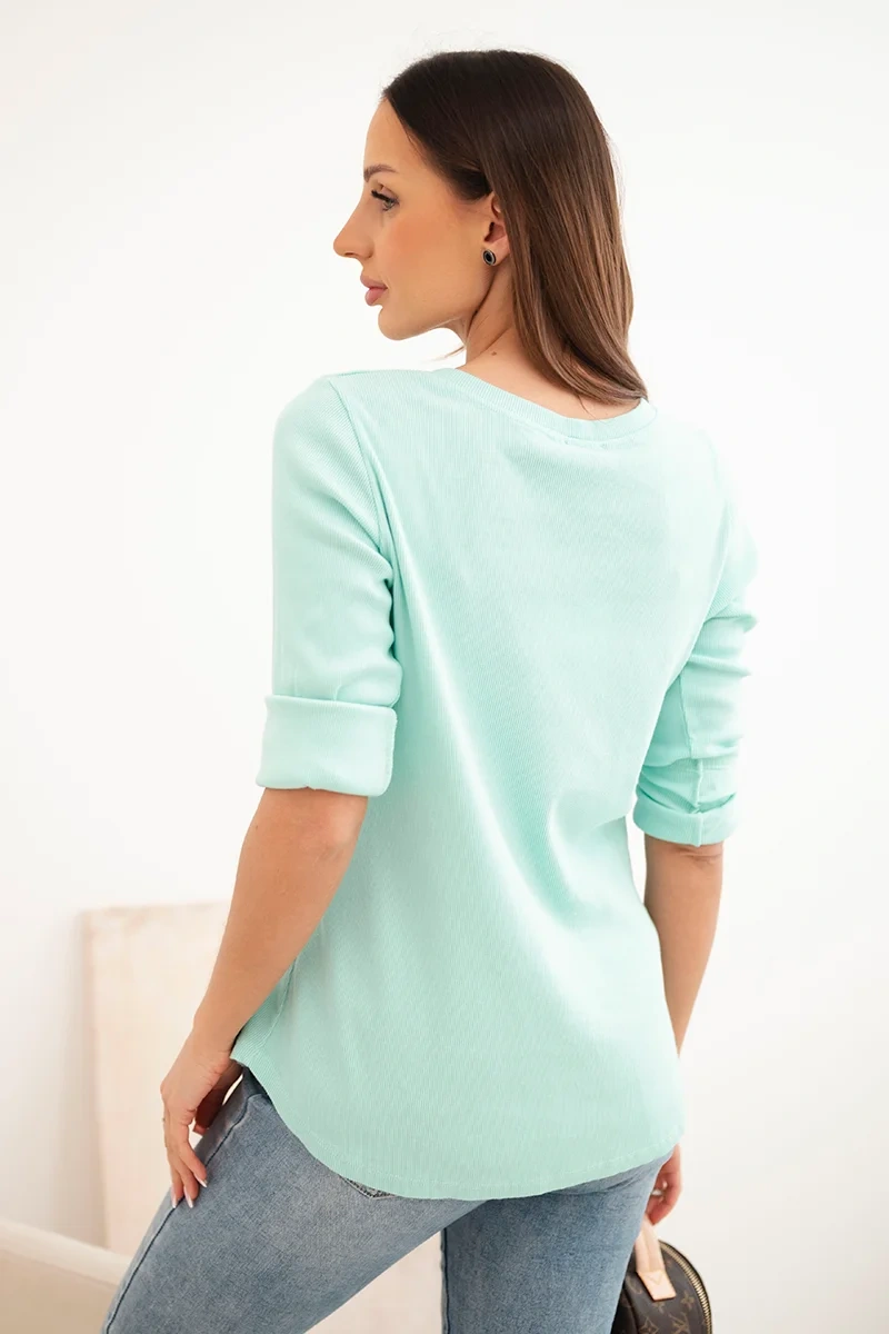 Bluzka damska bawełniana z długim rękawem i guzikami przy dekolcie miętowa to idealny wybór na co dzień. Uszyta z przyjemnej w dotyku, elastycznej bawełny, gwarantuje komfort noszenia przez cały dzień. Delikatny prążkowany materiał pięknie układa się na sylwetce, a subtelne guziki przy dekolcie dodają całości charakteru i kobiecego uroku.