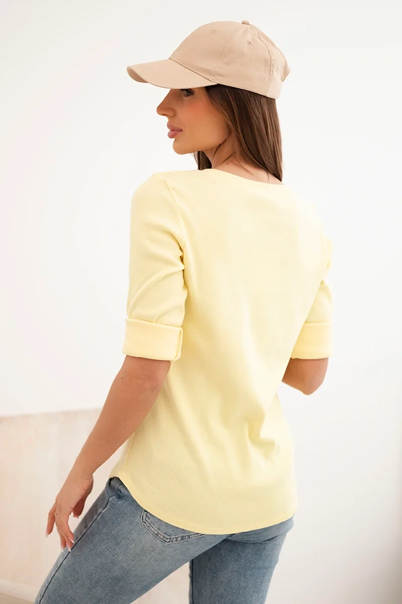 Bluzka damska bawełniana z długim rękawem i guzikami przy dekolcie żółta to idealny wybór na co dzień. Uszyta z przyjemnej w dotyku, elastycznej bawełny, gwarantuje komfort noszenia przez cały dzień. Delikatny prążkowany materiał pięknie układa się na sylwetce, a subtelne guziki przy dekolcie dodają całości charakteru i kobiecego uroku.