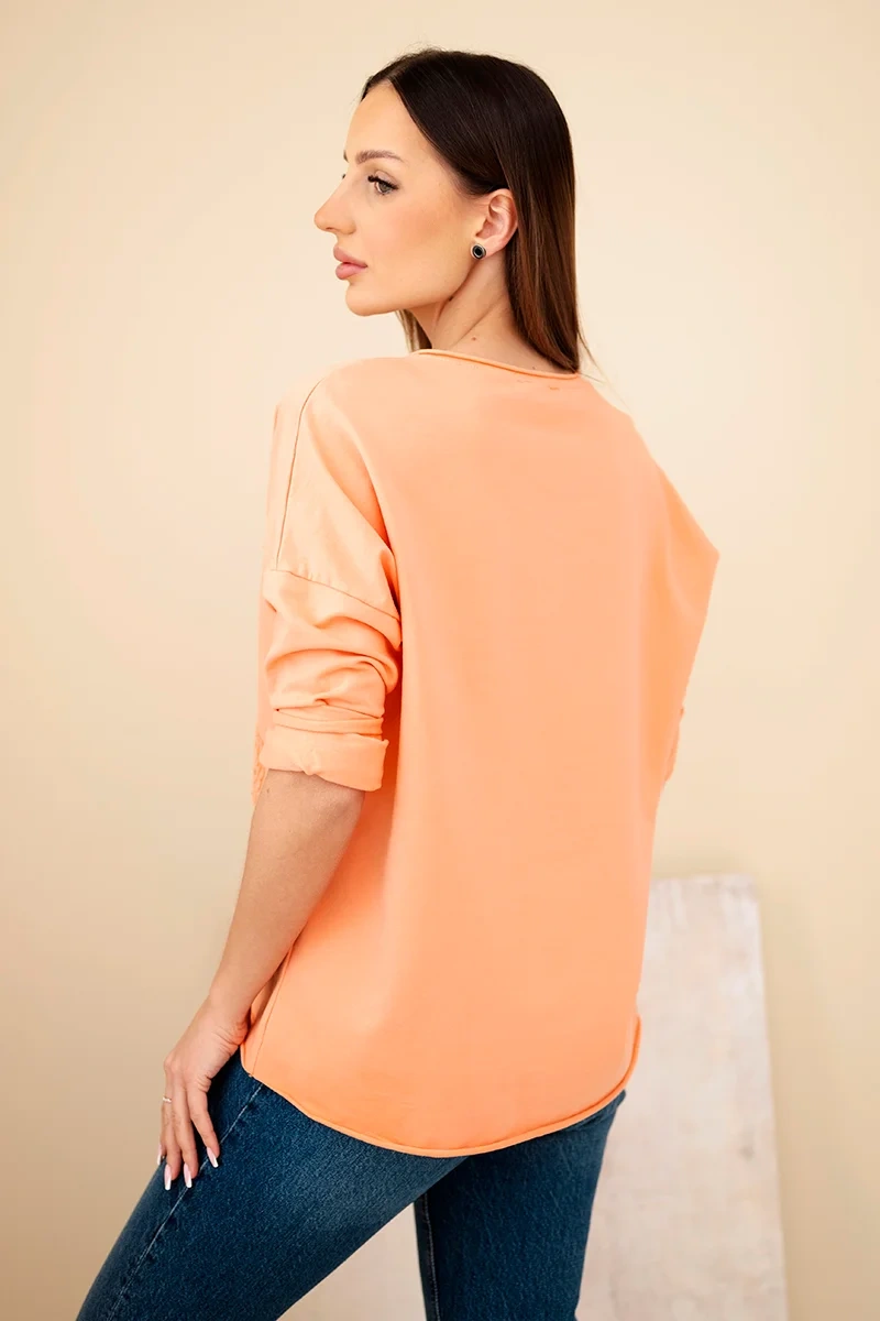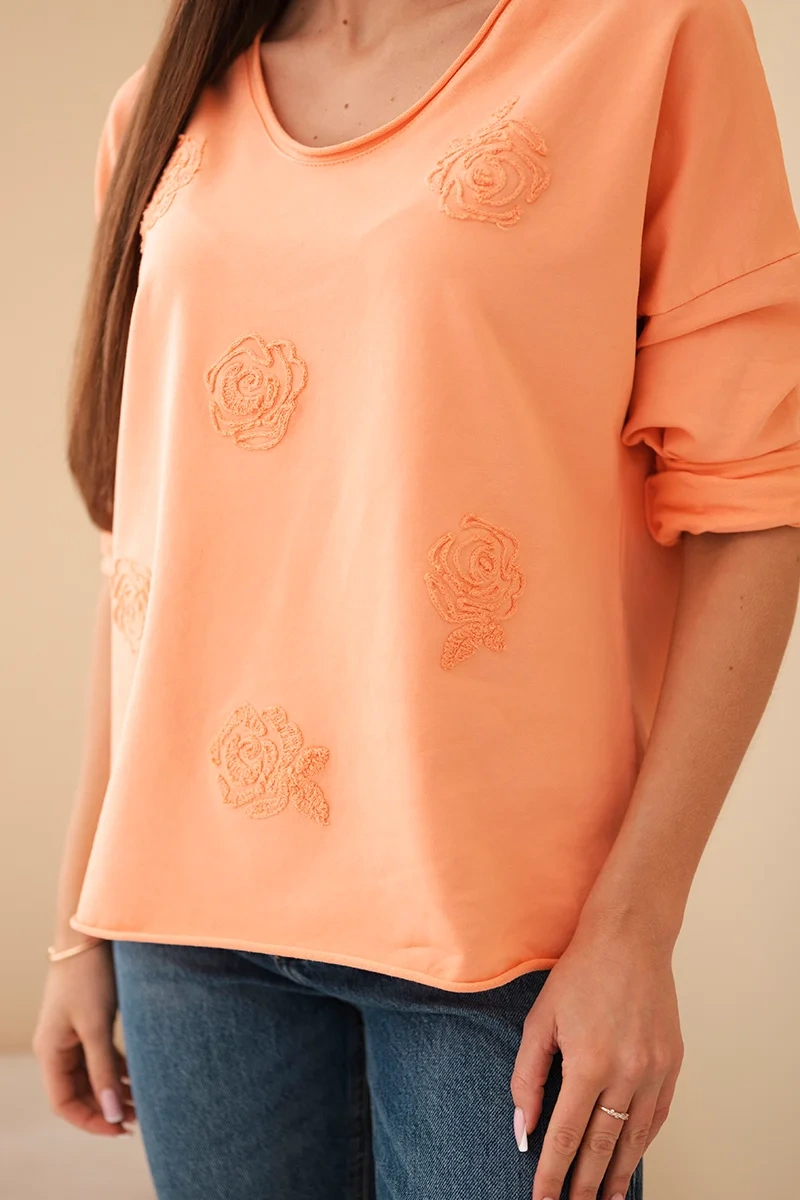Bluzka damska bawełniana z haftowanymi kwiatami i dekoltem V morelowa Jeśli szukasz wygodnej i stylowej bluzki idealnej na co dzień – ten model będzie strzałem w dziesiątkę! Bluzka damska z dekoltem w serek zachwyca subtelnymi, haftowanymi kwiatami na przodzie, które dodają jej uroku i kobiecego charakteru. Wykonana z miękkiej, elastycznej bawełny, gwarantuje komfort noszenia przez cały dzień. Długi rękaw oraz luźniejszy fason sprawiają, że bluzka świetnie układa się na sylwetce i pasuje do różnych stylizacji – zarówno do jeansów, jak i spódniczek.