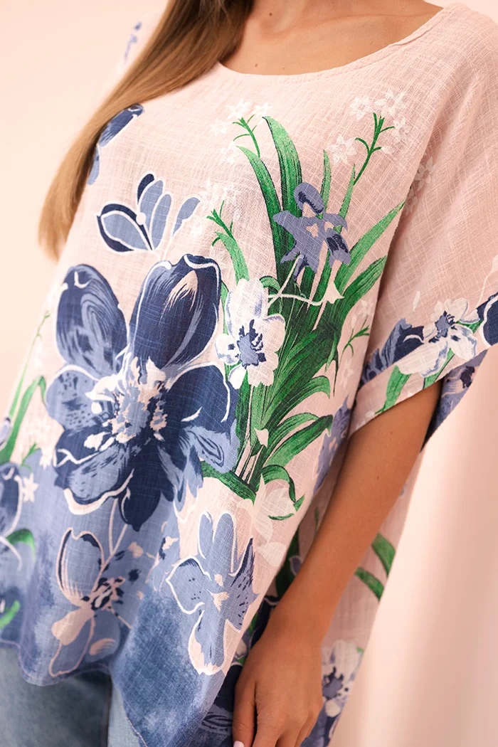 Bluzka damska bawełniana z kwiatowym nadrukiem i krótkim rękawem pudrowy róż Postaw na komfort i kobiecy styl dzięki tej bluzce damskiej z krótkim rękawem i efektownym nadrukiem w kwiaty. Model wykonany w 100% z bawełny to idealna propozycja na cieplejsze dni – naturalny materiał zapewnia przewiewność i wygodę noszenia przez cały dzień. Luźny fason sprawia, że bluzka świetnie leży na każdej sylwetce, a jej kwiatowy wzór dodaje uroku i świeżości. Doskonale komponuje się zarówno z jeansami, jak i lekką spódnicą czy szortami. Świetna opcja na spacer, zakupy lub codzienne spotkania. Produkcja włoska gwarantuje jakość i dbałość o detale. Rozmiar jest uniwersalny i będzie odpowiedni dla Pań w rozmiarze S, M lub L.