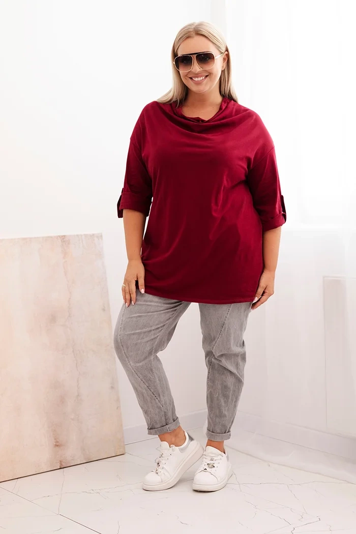 Bluzka damska Plus Size z bawełną o luźnym kroju z dekoltem wodnym bordowa to doskonały wybór do codziennych stylizacji, jak i bardziej eleganckich zestawów. Miękka dzianina bawełniana z dodatkiem elastanu idealnie dopasowuje się do sylwetki, nie krępując ruchów. Luźny fason świetnie maskuje niedoskonałości, a dekolt wodny subtelnie podkreśla kobiecy charakter stylizacji.