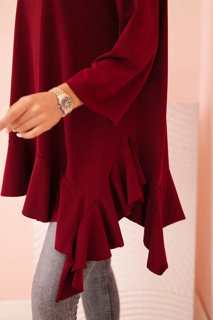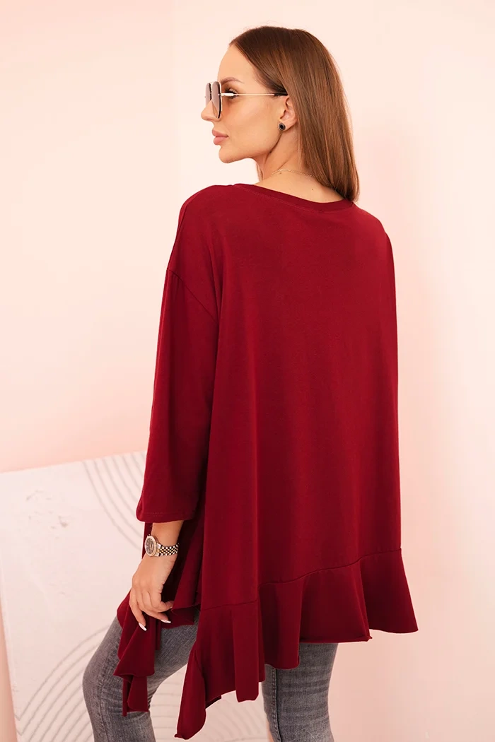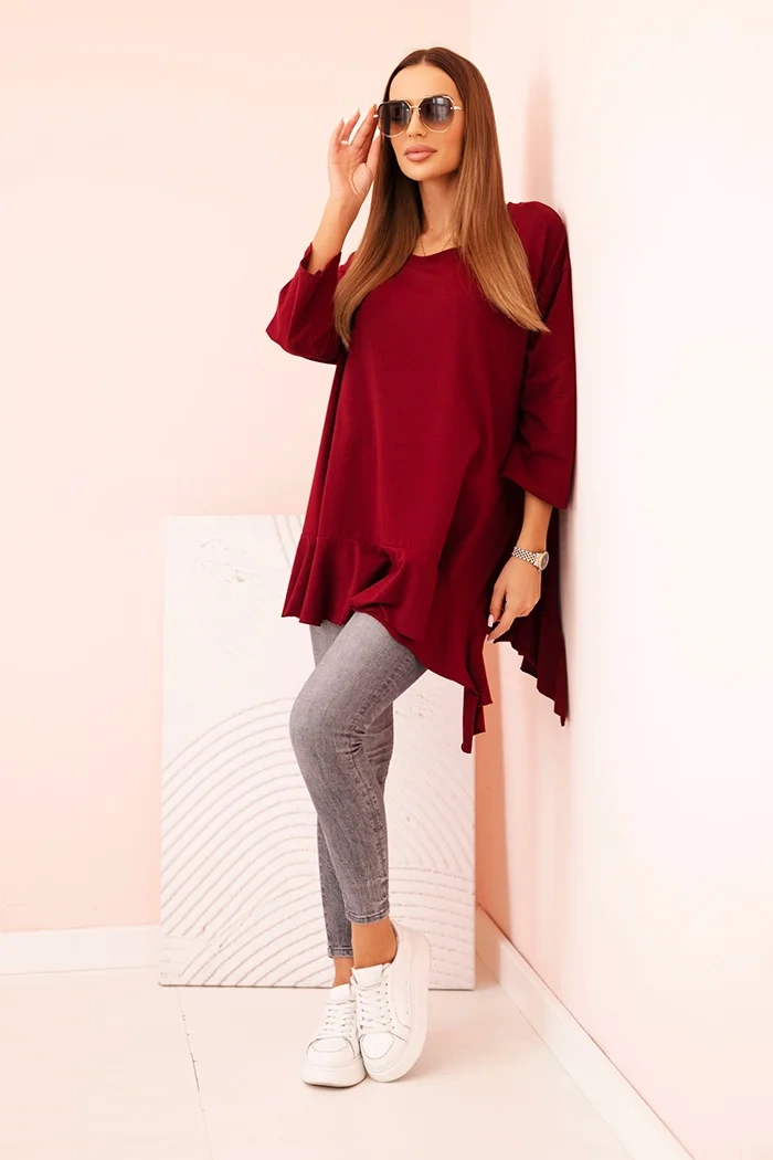 Bluzka damska Plus Size z bawełną z falbaną i rękawem podwijanym bordowa Ta bluzka damska plus size z bawełną to wyjątkowy model, który łączy wygodę z modnym, kobiecym akcentem. Uszyta z miękkiej i elastycznej dzianiny bawełnianej, zapewnia komfort noszenia przez cały dzień. Luźny fason nie opina sylwetki, a dekoracyjna falbana na dole dodaje bluzce lekkości i charakteru.