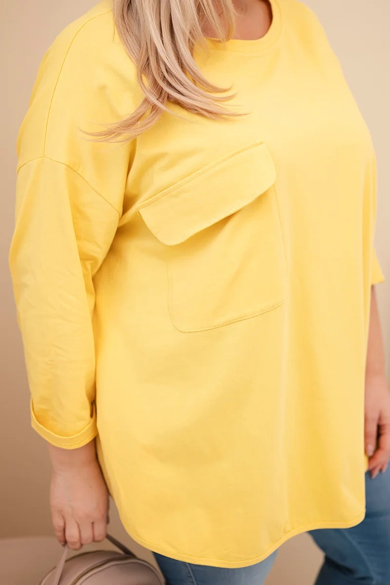 Bluzka damska Plus Size z bawełną z kieszenią i rękawem podwijanym żółta to idealna propozycja dla kobiet, które szukają wygody i luźnego fasonu na co dzień. Wykonana z wysokiej jakości bawełny z dodatkiem elastanu, doskonale dopasowuje się do sylwetki, zapewniając komfort noszenia i swobodę ruchów. Luźny krój nie krępuje ciała, a modna kieszeń na biuście dodaje całości oryginalnego charakteru.
