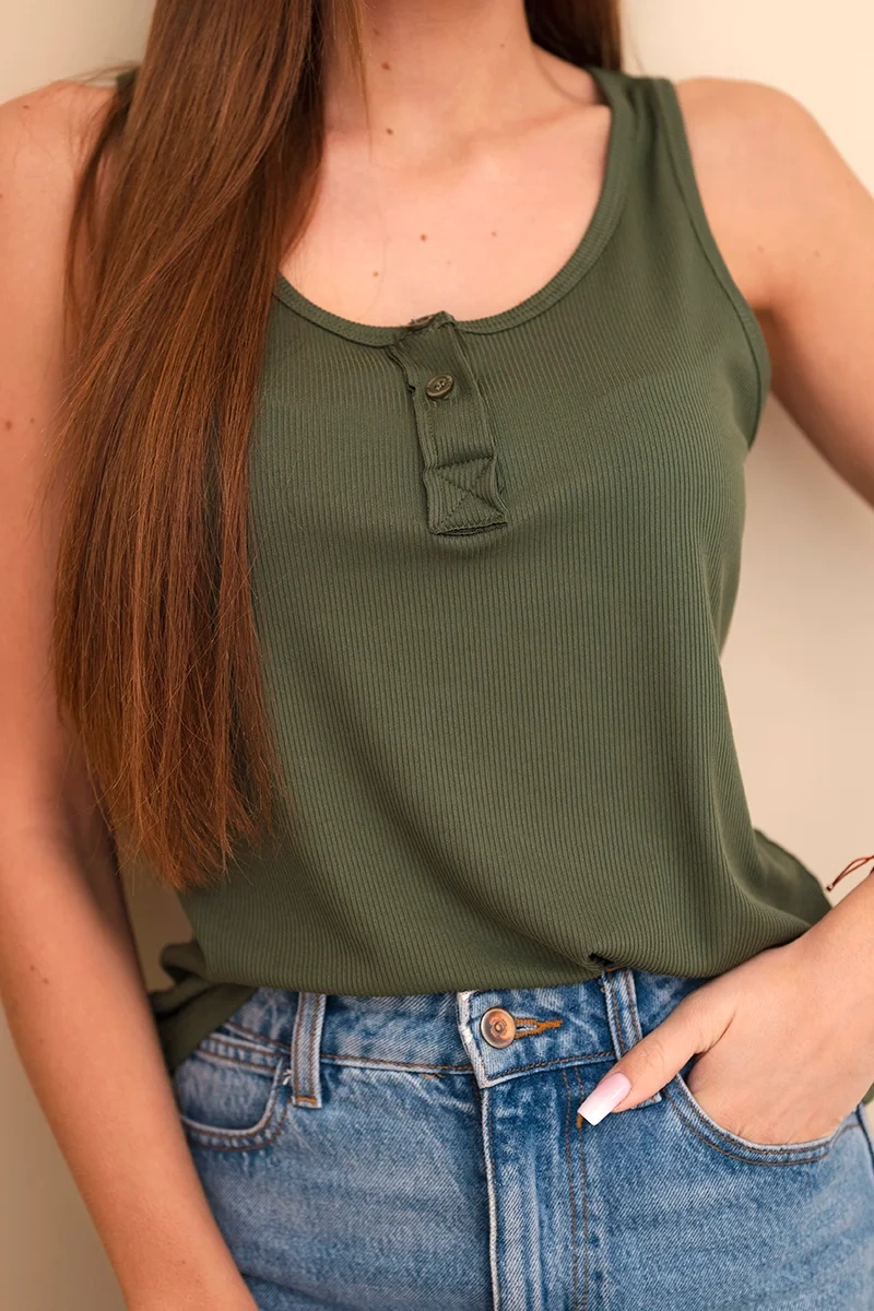 Bluzka damska prążkowana na ramiączkach z guzikiem khaki