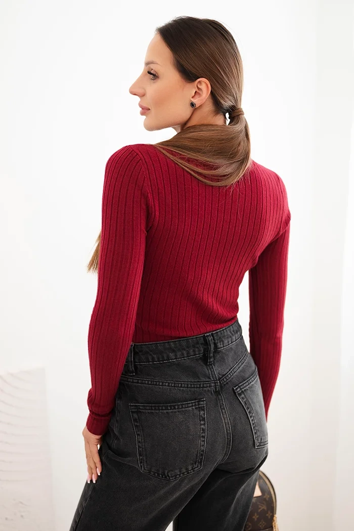 Bluzka damska prążkowana z golfem bordowa Stylowa bluzka damska o prążkowanej strukturze to idealna propozycja dla kobiet ceniących minimalizm i wygodę. Model z długim rękawem i stójką świetnie sprawdzi się jako baza pod marynarkę, kardigan lub solo do jeansów i spódnicy. Krótszy fason pięknie podkreśla talię i sprawia, że sylwetka nabiera lekkości.
