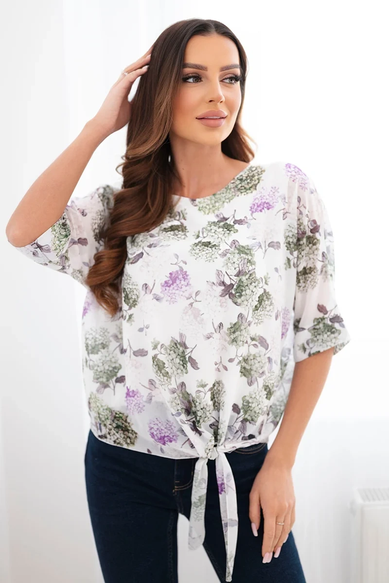 Bluzka posiada rękaw o długości 3/4, który dodaje jej lekkości i uniwersalnego charakteru. Dodatkowym atutem jest wiązanie na dole, które pozwala na subtelne dopasowanie do sylwetki oraz tworzy modny efekt stylizacji. Podszewka zwiększa komfort noszenia i sprawia, że materiał nie prześwituje.