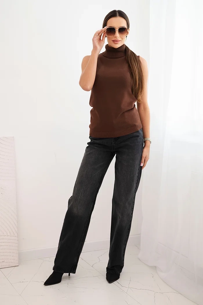 Bluzka damska wiskozowa bez rękawów z golfem brązowa Szukasz stylowej i wygodnej bluzki, która sprawdzi się idealnie w chłodniejsze dni? Bluzka damska bez rękawów z modnym golfem to doskonały wybór dla kobiet ceniących minimalizm i elegancję. Wykonana z miękkiej i elastycznej dzianiny, świetnie układa się na sylwetce i gwarantuje komfort przez cały dzień.