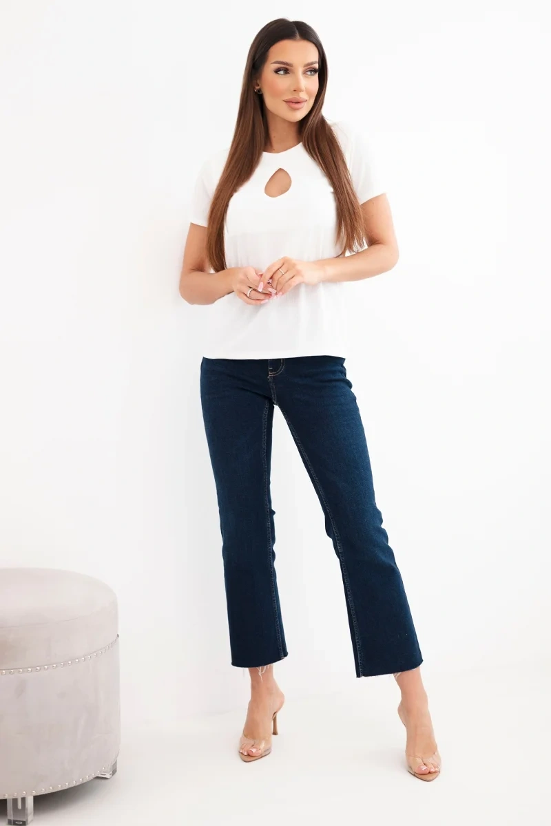 Bluzka damska wiskozowa prążkowana z ozdobnym wycięciem przy dekolcie biała Elegancka i jednocześnie niezwykle wygodna bluzka damska prążkowana to doskonała propozycja dla kobiet, które cenią sobie połączenie klasyki z nowoczesnym detalem. Model z krótkim rękawem świetnie sprawdzi się w codziennych stylizacjach, jak i w bardziej eleganckich zestawach do pracy czy na spotkania. Subtelne, owalne wycięcie przy dekolcie nadaje bluzce kobiecego charakteru i delikatnie podkreśla linię szyi.