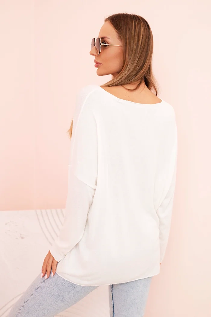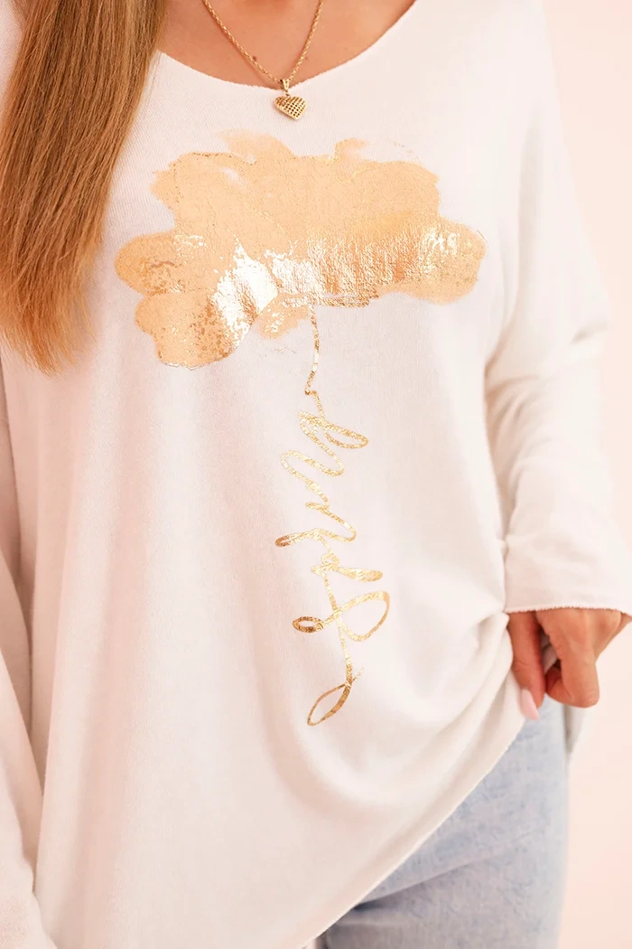Model o luźniejszym kroju z delikatnie opadającym rękawem zapewnia komfort i swobodę ruchów, a dekolt w łódkę dodaje całości kobiecego charakteru. Dekoracyjny nadruk ze złotym połyskiem przyciąga wzrok i dodaje stylizacji wyjątkowego uroku.