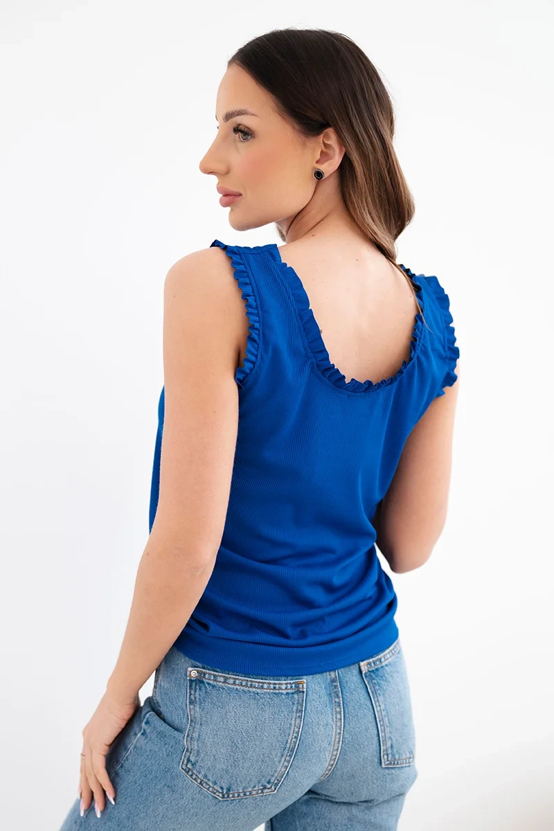 Bluzka damska z wiskozy z falbanką przy dekolcie chabrowa Stylowa i niezwykle kobieca bluzka damska bez rękawów to idealny wybór na cieplejsze dni. Wykonana z przyjemnej w dotyku wiskozy z dodatkiem elastanu, świetnie dopasowuje się do sylwetki i zapewnia wysoki komfort noszenia przez cały dzień. Delikatne falbanki przy dekolcie i ramionach nadają jej subtelny, romantyczny charakter. Doskonała zarówno do codziennych stylizacji, jak i na bardziej eleganckie wyjścia – wystarczy połączyć ją z ulubioną spódnicą lub spodniami.
