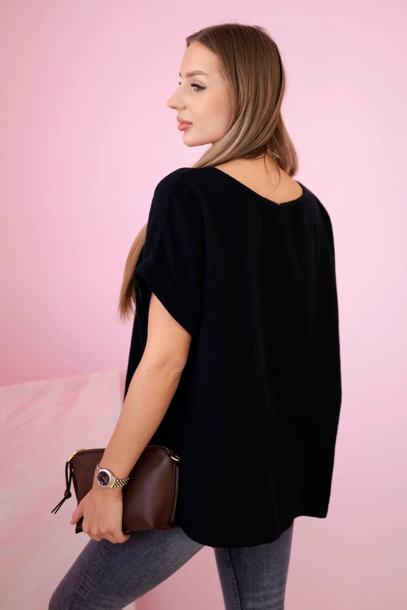 Bluzka muślinowa z naszyjnikiem czarna Bluzka muślinowa z naszyjnikiem to idealny wybór dla kobiet ceniących subtelny styl i wyjątkowy komfort noszenia. Wykonana z lekkiego, przewiewnego muślinu, zapewnia delikatność i swobodę ruchów przez cały dzień. Jej luźny, elegancki krój sprawia, że doskonale układa się na sylwetce, podkreślając jej naturalne piękno. Dopełnieniem bluzki jest ozdobny naszyjnik, który dodaje jej charakteru i eliminuje potrzebę dodatkowych akcesoriów. Dzięki temu model ten świetnie sprawdzi się zarówno na co dzień, jak i na bardziej formalne okazje. Można ją łączyć z jeansami, eleganckimi spodniami czy spódnicą, tworząc stylizacje idealne na każdą okazję. Postaw na bluzkę muślinową z naszyjnikiem i ciesz się ponadczasową elegancją w lekkim, kobiecym wydaniu. Rozmiar jest uniwersalny i będzie odpowiedni dla Pań noszących rozmiar S, M lub L.