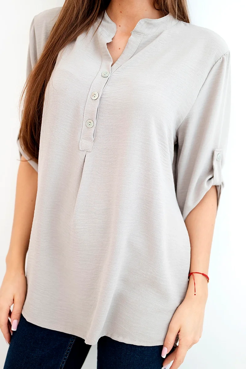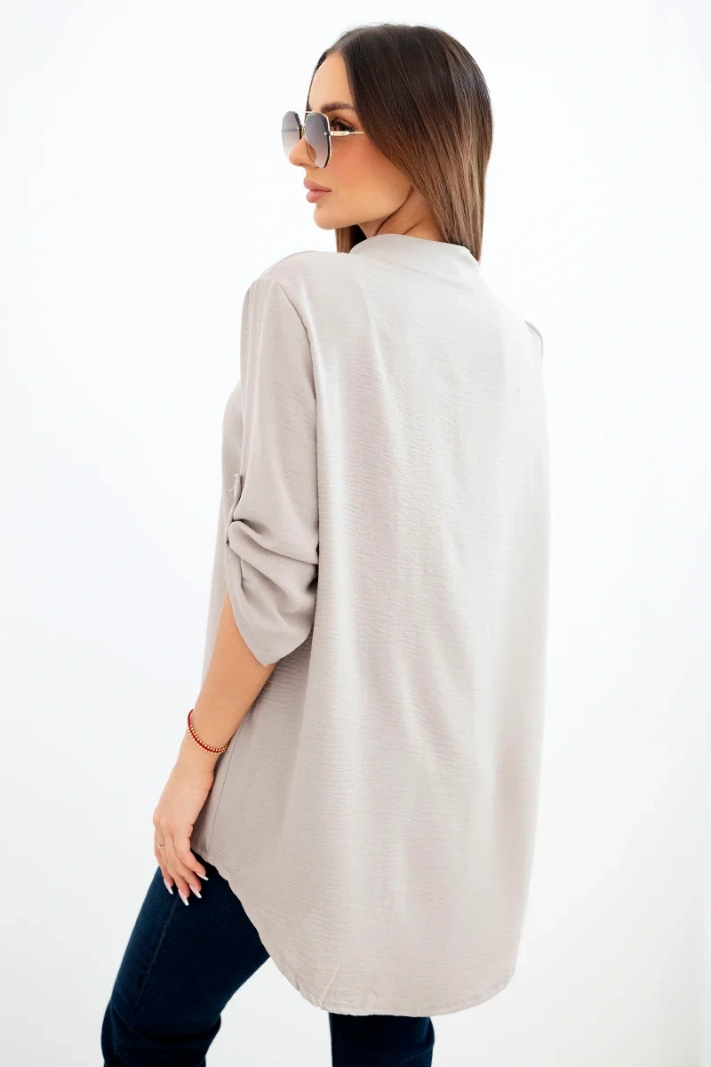 Bluzka z dłuższym tyłem fango Odkryj niezwykłą elegancję i wygodę w prezentowanej bluzce z dłuższym tyłem, dekoltem na guziki i podwijanymi rękawami, ta bluzka nie tylko prezentuje się wyjątkowo stylowo, ale także zapewnia niezrównaną funkcjonalność. Poczuj się pewnie i elegancko w bluzce, która podkreśli Twój wyjątkowy styl. Dzięki dłuższemu tyłowi stworzysz subtelne i modnie nieregularne proporcje, a dekolt na guziki pozwoli Ci dopasować bluzkę do swoich preferencji. Podwijane rękawy dodają bluzce lekkości i swobodnego charakteru, idealnego na różne okazje. Niezależnie od tego, czy to spotkanie biznesowe czy relaksująca kawa z przyjaciółkami, nasza bluzka zapewni Ci wygodę i styl w jednym. Nie przegap okazji, aby dodać tę wyjątkową bluzkę do swojej garderoby! Odkryj elegancję, wygodę i funkcjonalność w jednym, i podkreśl swój niepowtarzalny styl już dziś. Rozmiar jest uniwersalny i będzie odpowiedni dla Pań noszących rozmiar S, M lub L.