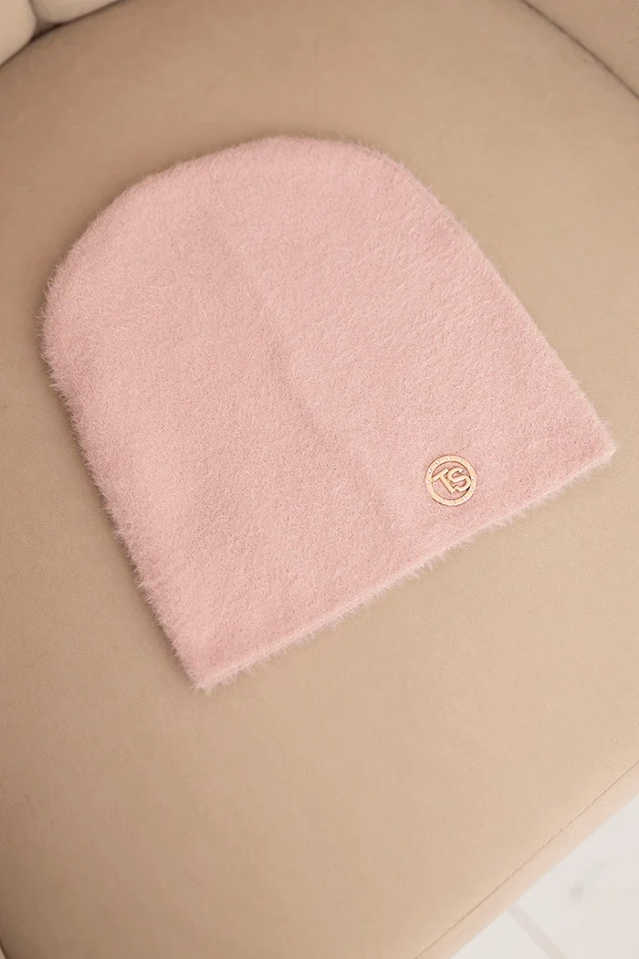 Czapka damska klasyczna z miękkiej dzianiny z dekoracyjną blaszką pudrowy róż Minimalistyczna i elegancka czapka damska wykonana z bardzo miękkiej i przyjemnej w dotyku puszystej dzianiny. Z przodu subtelna ozdobna blaszka z logo, która dodaje stylowego akcentu.