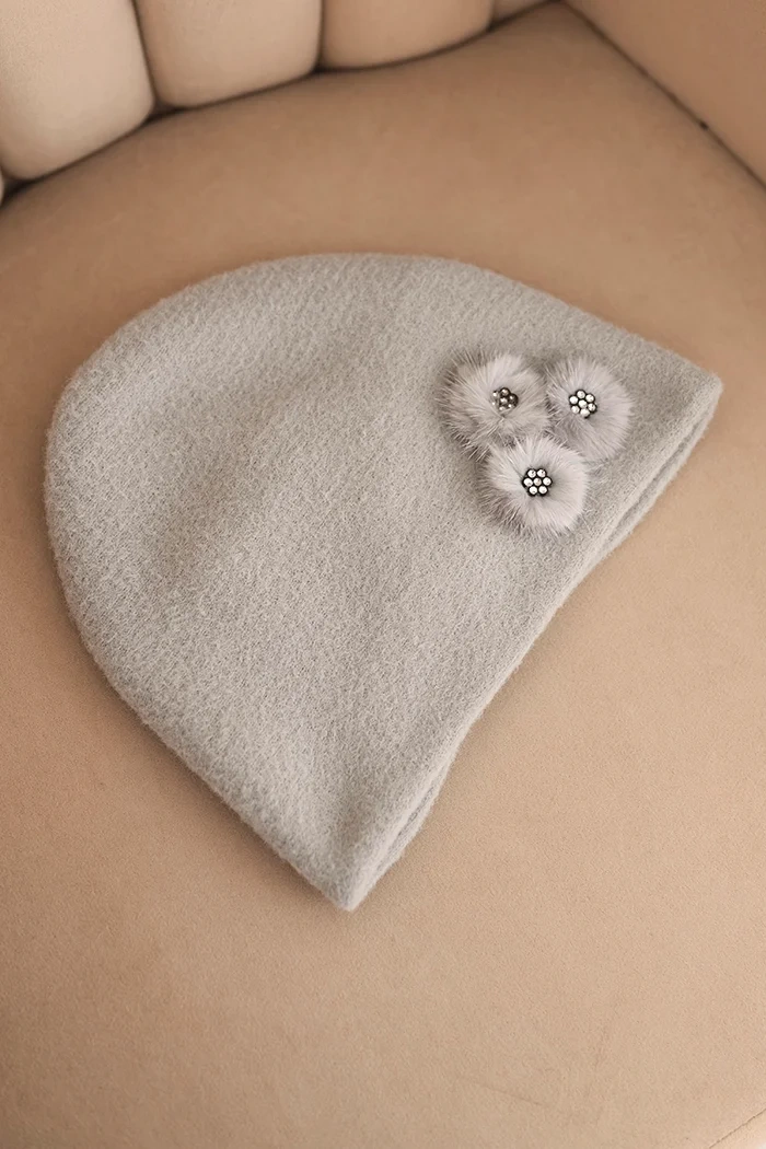 Czapka damska z ozdobnymi futrzanymi kwiatami elegancka jasno szara Stylowa czapka damska w eleganckim wydaniu, idealna na jesień i zimę. Wykonana z przyjemnego, ciepłego materiału, dobrze dopasowuje się do głowy, zapewniając komfort termiczny.