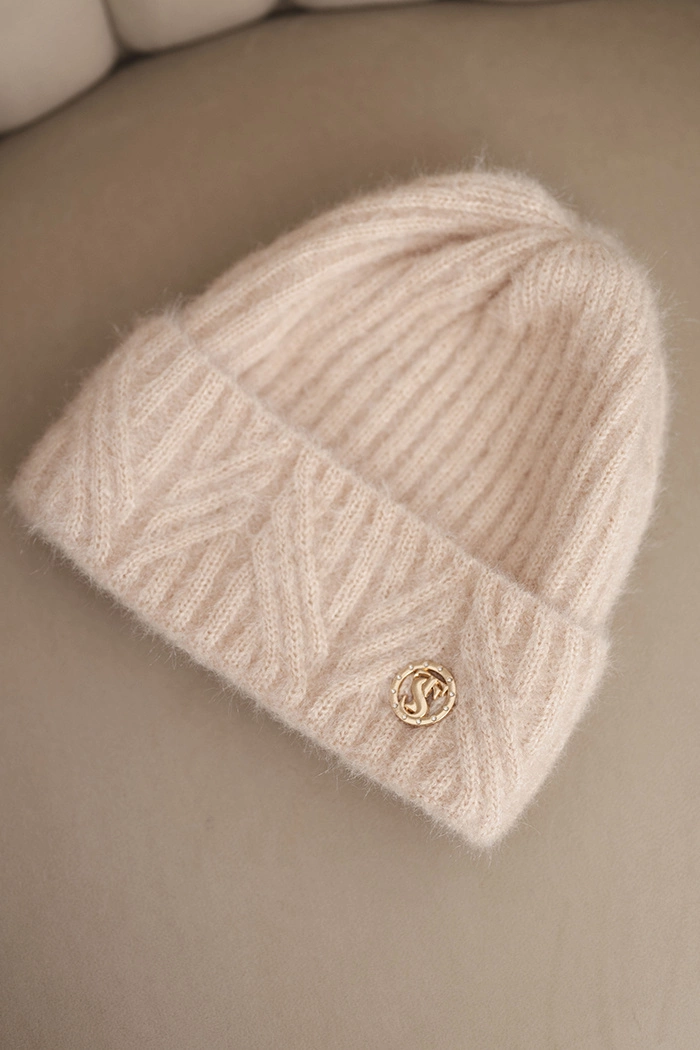 Czapka ozdobiona została eleganckim złotym guzikiem z przodu, który nadaje jej wyjątkowego charakteru. Delikatny pastelowy kolor doskonale wpisuje się w kobiece, zimowe stylizacje.