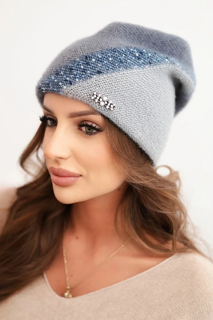 Czapka damska zimowa z puszystej dzianiny z ozdobną aplikacją grafitowy + szary Stylowa i elegancka czapka damska zimowa to idealny wybór na chłodniejsze dni. Wykonana z miękkiej, puszystej dzianiny z dodatkiem wiskozy, zapewnia ciepło, komfort i przyjemne dopasowanie do głowy.