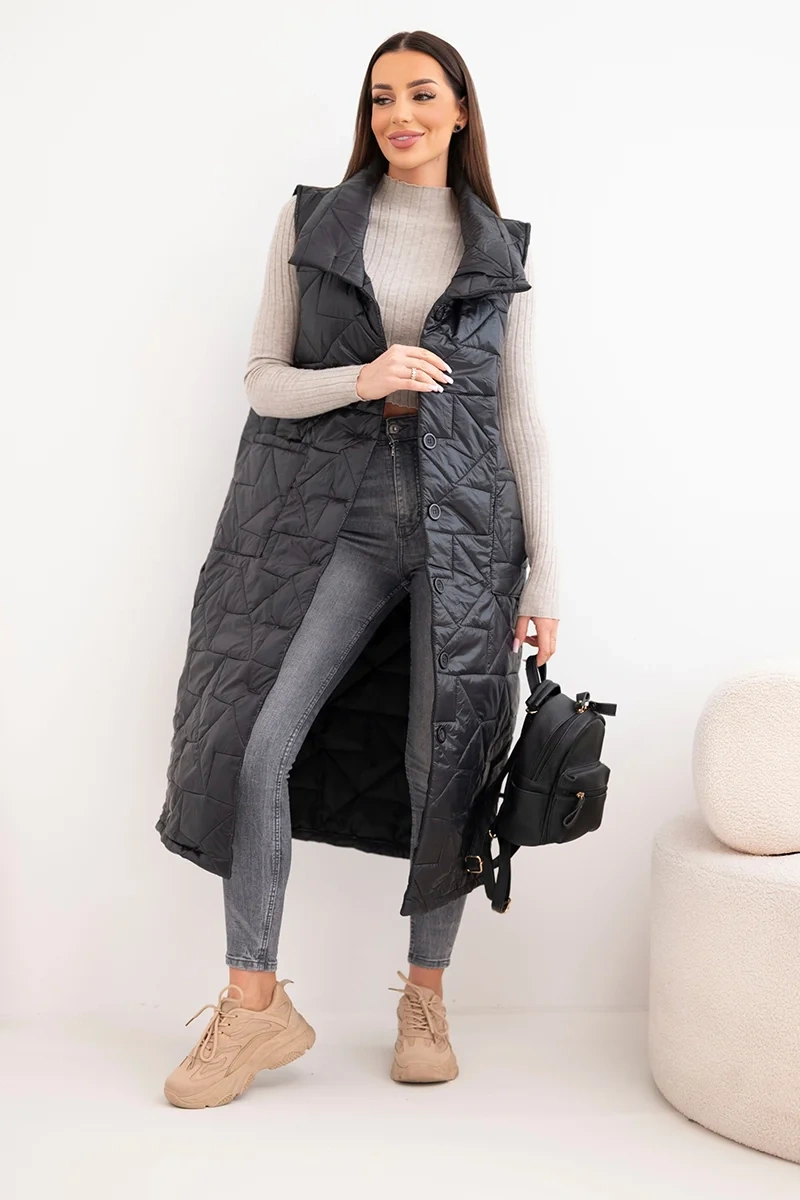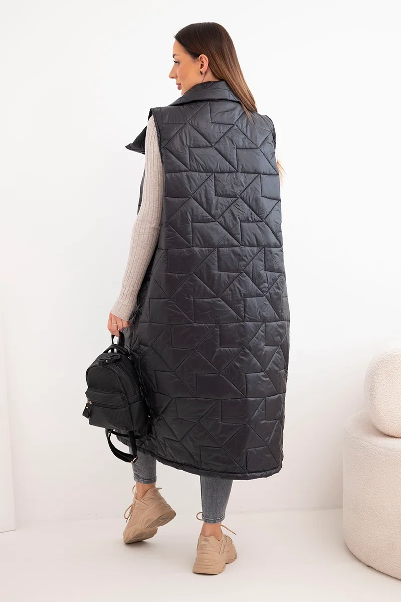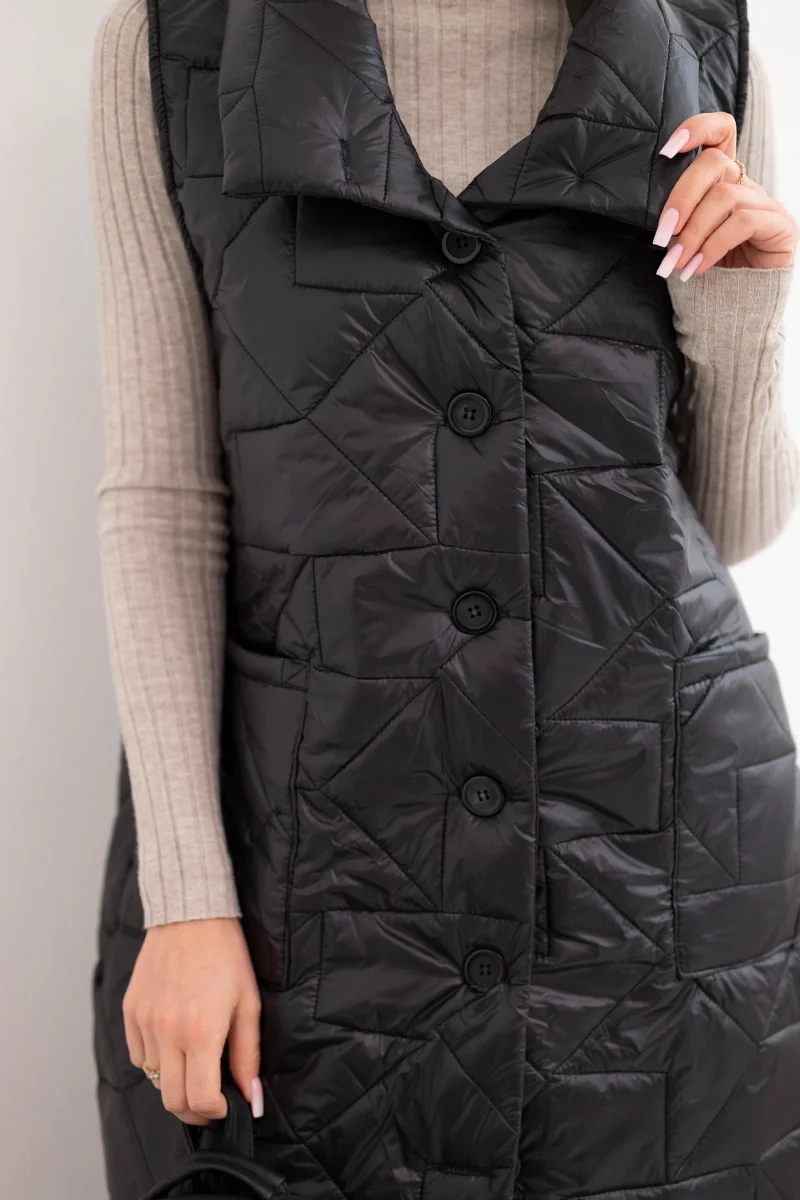 Kamizelka damska pikowana długa z kieszeniami i stójką czarna Stylowa i funkcjonalna kamizelka damska to doskonały wybór dla kobiet, które cenią wygodę oraz modny wygląd. Długi fason sprawia, że kamizelka świetnie sprawdzi się w chłodniejsze dni, zapewniając dodatkową ochronę przed zimnem, a jednocześnie pozostaje lekka i komfortowa w noszeniu. Pikowany materiał nadaje jej nowoczesnego charakteru, dzięki czemu łatwo dopasujesz ją zarówno do codziennych stylizacji, jak i bardziej sportowych zestawów.