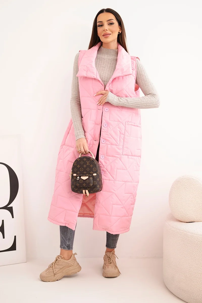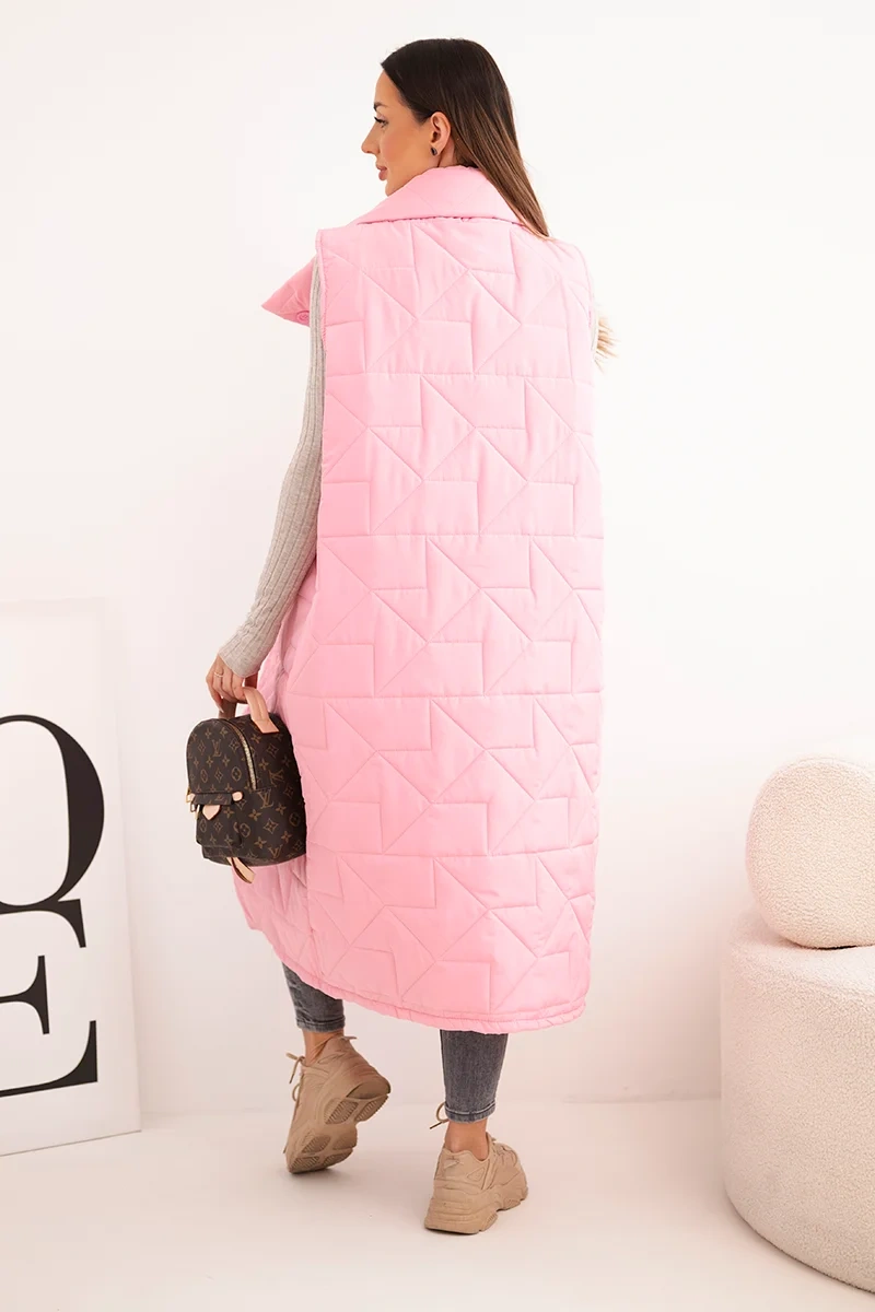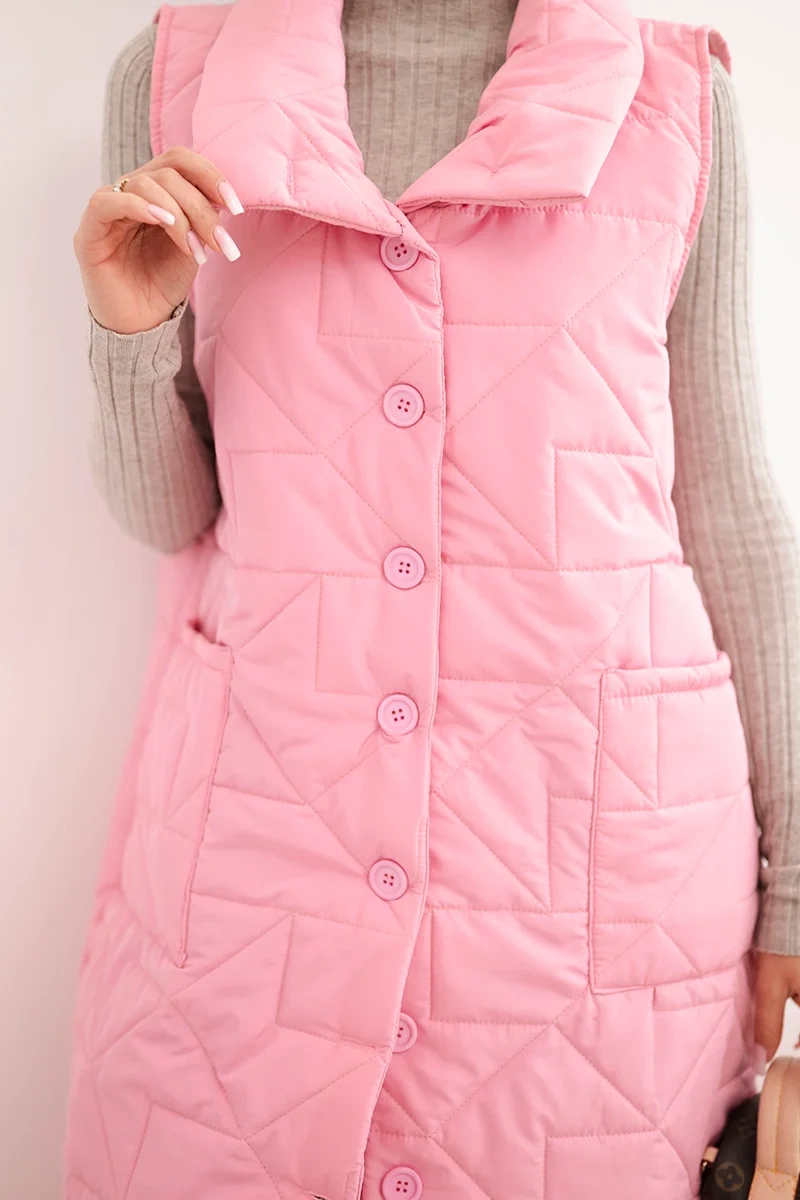 Kamizelka damska pikowana długa z kieszeniami i stójką jasno różowa