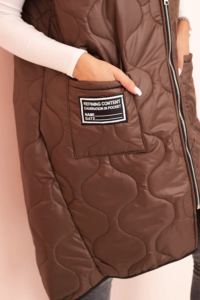 Kamizelka damska pikowana Plus Size z kapturem zapinana na zamek brązowa Pikowana kamizelka damska Plus Size to idealna propozycja na chłodniejsze dni. Dzięki praktycznemu kapturowi oraz wygodnemu zapięciu na zamek sprawdzi się zarówno w miejskich stylizacjach, jak i podczas spacerów. Model ma modny, geometryczny wzór pikowania, który dodaje całości charakteru, a długość sięgająca za biodra świetnie modeluje sylwetkę. Obszerne kieszenie z przodu zwiększają funkcjonalność, a ozdobna naszywka dodaje sportowego stylu. Ta kamizelka to połączenie wygody i stylu – wykonana z lekkiego, ale trwałego materiału, idealna do noszenia przez cały sezon przejściowy. Można ją zestawić z legginsami, jeansami lub sportową sukienką, tworząc modne, warstwowe stylizacje. Rozmiar jest uniwersalny i będzie odpowiedni dla Pań w rozmiarze L, XL, XXL.