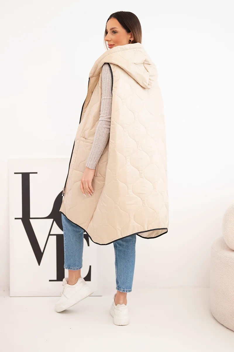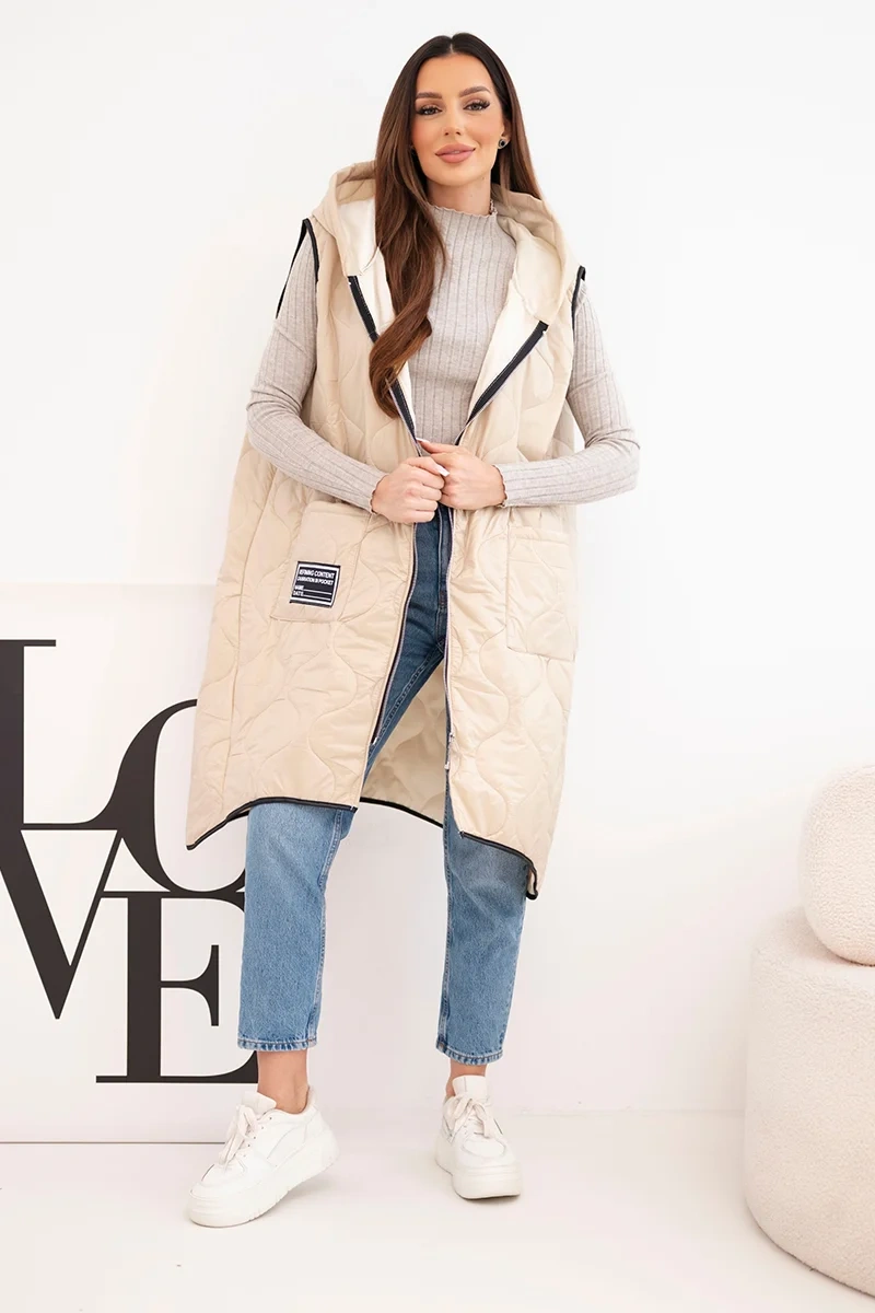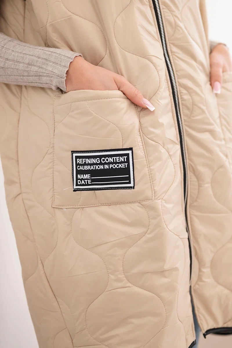 Kamizelka damska pikowana Plus Size z kapturem zapinana na zamek ciemno beżowa Pikowana kamizelka damska Plus Size to idealna propozycja na chłodniejsze dni. Dzięki praktycznemu kapturowi oraz wygodnemu zapięciu na zamek sprawdzi się zarówno w miejskich stylizacjach, jak i podczas spacerów. Model ma modny, geometryczny wzór pikowania, który dodaje całości charakteru, a długość sięgająca za biodra świetnie modeluje sylwetkę. Obszerne kieszenie z przodu zwiększają funkcjonalność, a ozdobna naszywka dodaje sportowego stylu. Ta kamizelka to połączenie wygody i stylu – wykonana z lekkiego, ale trwałego materiału, idealna do noszenia przez cały sezon przejściowy. Można ją zestawić z legginsami, jeansami lub sportową sukienką, tworząc modne, warstwowe stylizacje. Rozmiar jest uniwersalny i będzie odpowiedni dla Pań w rozmiarze L, XL, XXL.