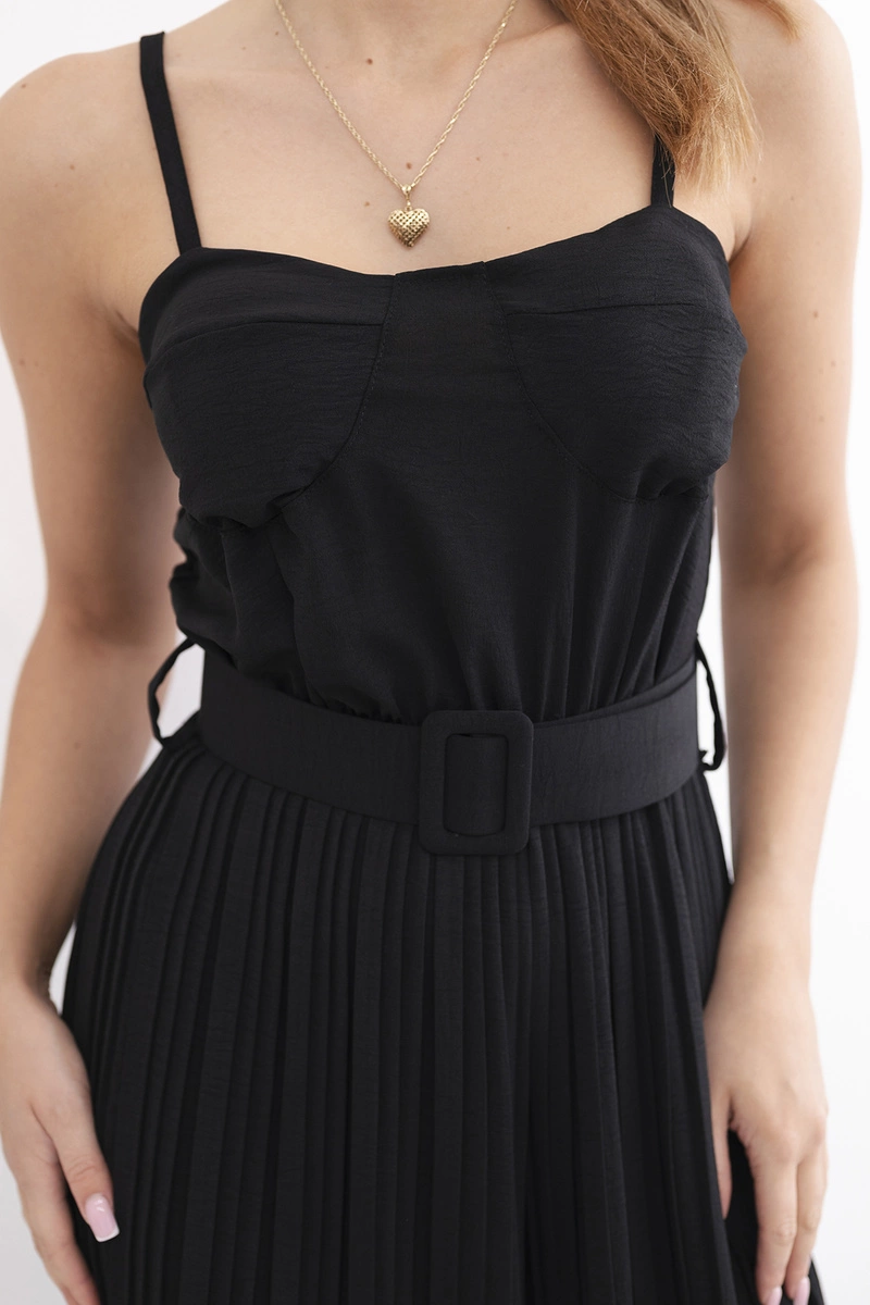 Kombinezon plisowany na ramiączka czarny to elegancki i wyrafinowany element garderoby, który nadaje kobiecej sylwetce subtelności i lekkości. Plisowane tkaniny są modne i dodają ubraniom niepowtarzalnego charakteru, a połączenie ich z kombinezonem tworzy efektowny i stylowy look. Ramiączka nadają kombinezonowi delikatności i kobiecego uroku, jednocześnie zapewniając wygodę noszenia. Jest to idealna opcja na wiele okazji, od letnich imprez po eleganckie wyjścia wieczorowe, gdzie chcesz wyglądać zarówno stylowo, jak i wygodnie. Dodatkowo, kombinezon jest również praktyczny, gdyż stanowi kompletną stylizację w jednym elemencie, co ułatwia komponowanie outfitu. Rozmiar jest uniwersalny i będzie pasował dla osób w rozmiarze S, M i L.