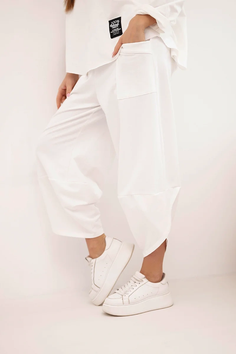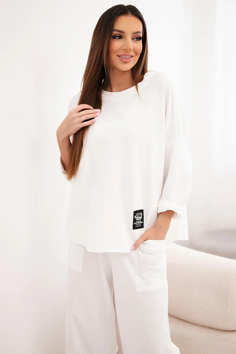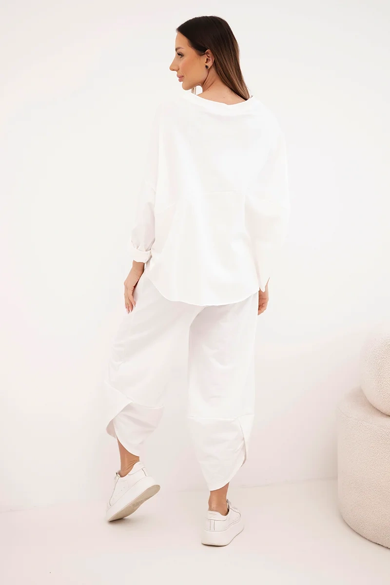 Komplet bawełniany bluza + spodnie ecru Włoski komplet to połączenie elegancji i wygody, które idealnie pasuje do wielu okazji. Ta tkanina jest nie tylko miękka i przyjemna w dotyku, ale także pięknie się prezentuje. Bluza to doskonały element garderoby zarówno na co dzień, jak i na specjalne okazje. Możesz nosić ją solo lub zestawić z inną częścią garderoby, tworząc niezwykle stylowy outfit. Spodnie to doskonałe uzupełnienie kompletu. Ich luźny krój pozwala na swobodę ruchów, co sprawia, że są one nie tylko stylowe, ale także bardzo wygodne. Wybierając spodnie, wybierasz komfort i elegancję w jednym. Włoski komplet to doskonały wybór dla tych, którzy cenią sobie wysoką jakość i wyjątkowy styl. Bez względu na to, czy wybierasz się na spotkanie z przyjaciółmi, do pracy, czy na wieczorne wyjście, ten zestaw z pewnością wyróżni cię z tłumu. Rozmiar jest uniwersalny i pasuje dla kobiet noszących rozmiar S, M lub L.