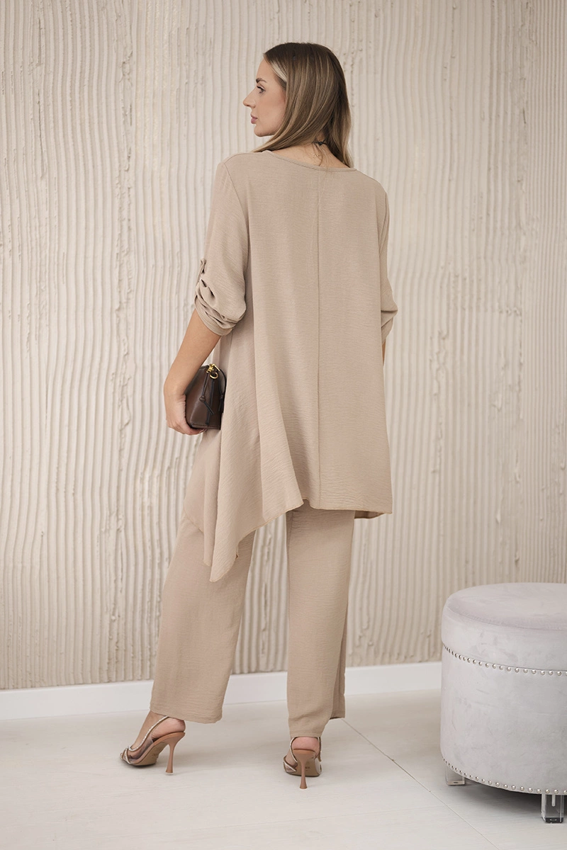 Komplet bluzka + spodnie z wisiorkiem cappuccino Komplet włoski dwuczęściowy składający się z rozkloszowanej bluzki oraz spodni to elegancki zestaw, który dodaje uroku i stylu każdej stylizacji. Bluzka o rozkloszowanym kroju nadaje subtelnej kobiecości, podkreślając figurę, a jednocześnie zapewniając swobodę ruchów. Klasyczny fason spodni sprawia, że doskonale komponują się z elegancką bluzką, tworząc spójną i stylową całość. Dodatkowo, wisiorek w kształcie klucza stanowi uroczy detal, który dodaje oryginalności i charakteru temu zestawowi, tworząc harmonijną kompozycję. To elegancki dodatek, który podkreśla wyjątkowość i dbałość o detale w całej stylizacji. Taki komplet włoski doskonale nadaje się na wiele okazji, od spotkań biznesowych po romantyczne randki. Jest to wyrafinowana opcja dla osób ceniących sobie elegancję i wygodę w jednym. Rozmiar jest uniwersalny i pasuje dla kobiet noszących rozmiar S, M lub L.