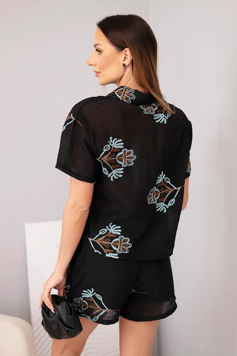 Modny komplet damski to idealna propozycja dla kobiet, które lubią stylowe i wygodne zestawy na cieplejsze dni. Zestaw składa się z koszuli z krótkim rękawem oraz spódnico-spodenek, które łączą elegancki wygląd spódnicy z komfortem noszenia szortów. Całość ozdobiona jest efektownym haftowanym wzorem roślinnym, który nadaje stylizacji wyjątkowego i kobiecego charakteru.