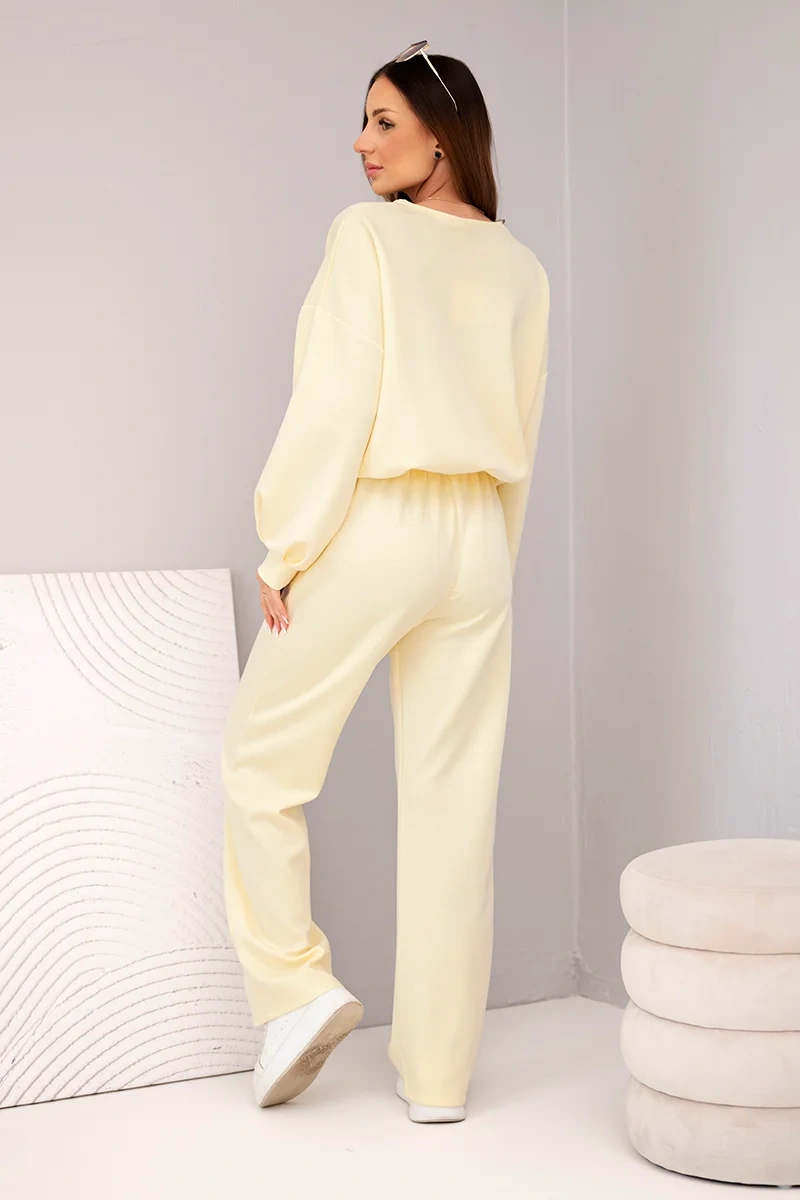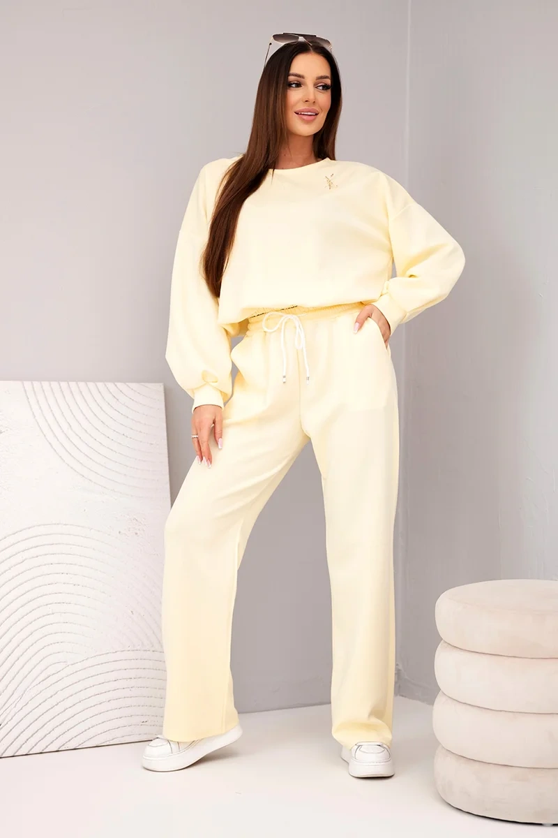 Napisz pierwszą opinię o „Komplet damski masełko bluza z broszką i spodnie z prostą nogawką żółty”
