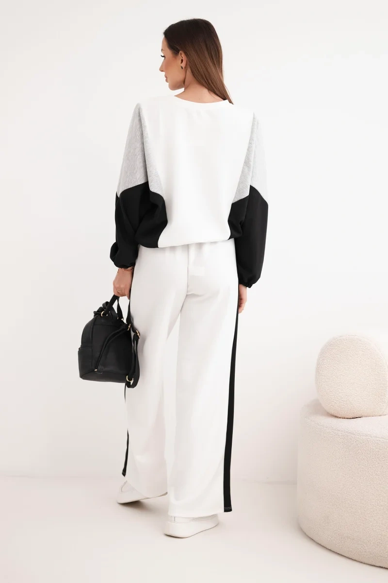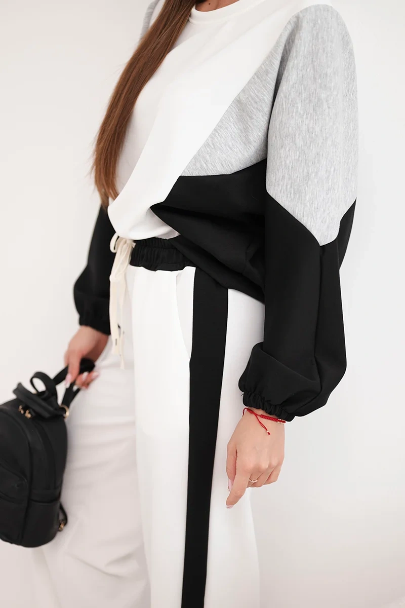 Bluza o luźnym kroju z obniżoną linią ramion i ściągaczem przy rękawach zapewnia swobodę ruchów oraz wyjątkową wygodę. Kontrastowe wstawki dodają jej modnego, nowoczesnego charakteru. Spodnie z elastycznym pasem i szeroką nogawką gwarantują komfort przez cały dzień, a ich minimalistyczny krój pięknie podkreśla sylwetkę.